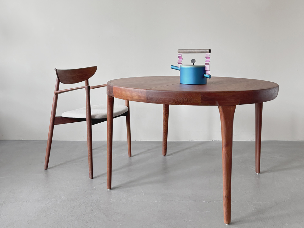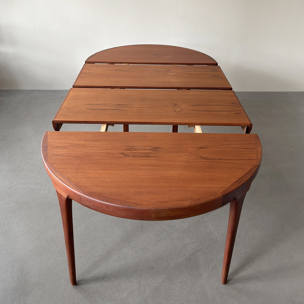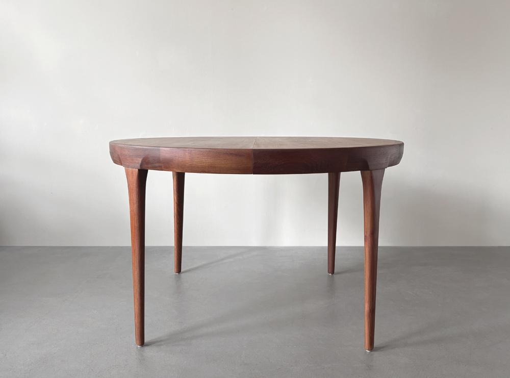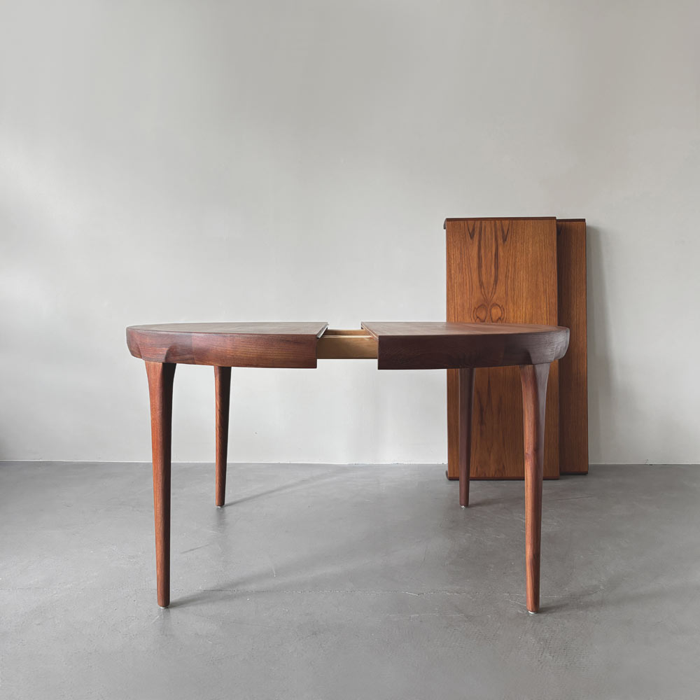 Entworfen um 1965 herum für den dänischen Hersteller Faarup Møbelfabrik, zeichnet sich der Esstisch durch schöne Details in der Linienführung, besonders im Übergang von Tischbeinen zur Platte, aus. Der runde Esstisch kann mit Hilfe von 2 Erweiterungsplatten verlängert werden. Bei maximalem Auszug klappt sich automatisch ein zusätzliches Standbein zur Unterstützung der Tischplatte aus. Ausgezogen ist der Esstisch bequem für 8-10 Personen geeignet.