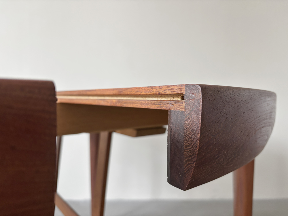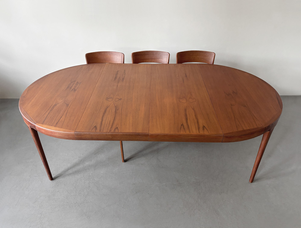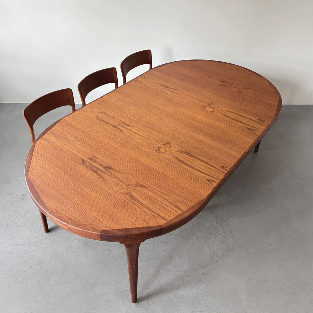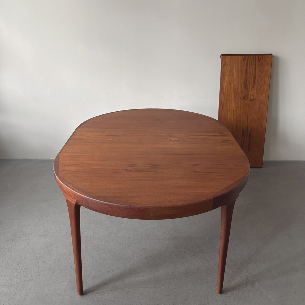 Entworfen um 1965 herum für den dänischen Hersteller Faarup Møbelfabrik, zeichnet sich der Esstisch durch schöne Details in der Linienführung, besonders im Übergang von Tischbeinen zur Platte, aus. Der runde Esstisch kann mit Hilfe von 2 Erweiterungsplatten verlängert werden. Bei maximalem Auszug klappt sich automatisch ein zusätzliches Standbein zur Unterstützung der Tischplatte aus. Ausgezogen ist der Esstisch bequem für 8-10 Personen geeignet.