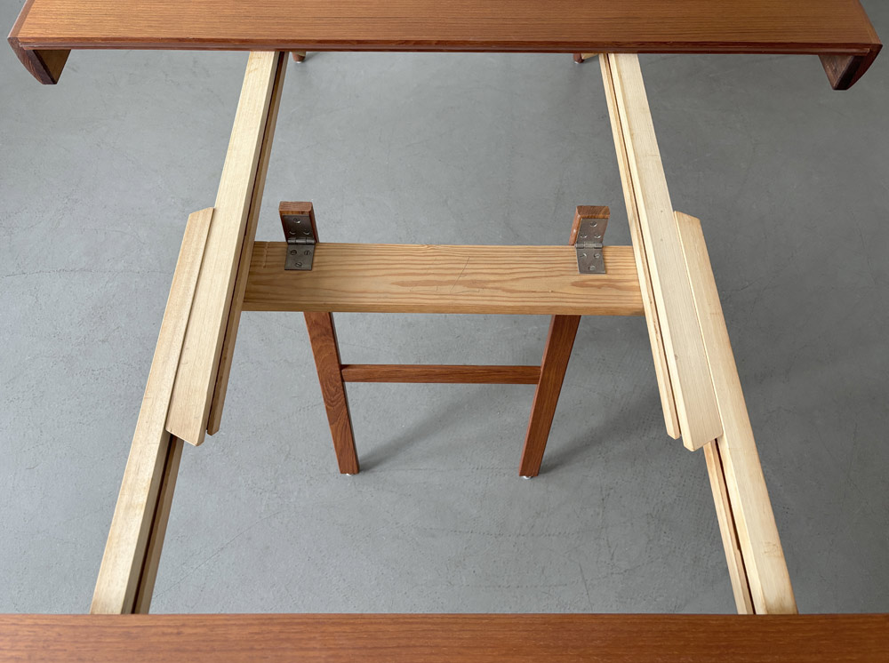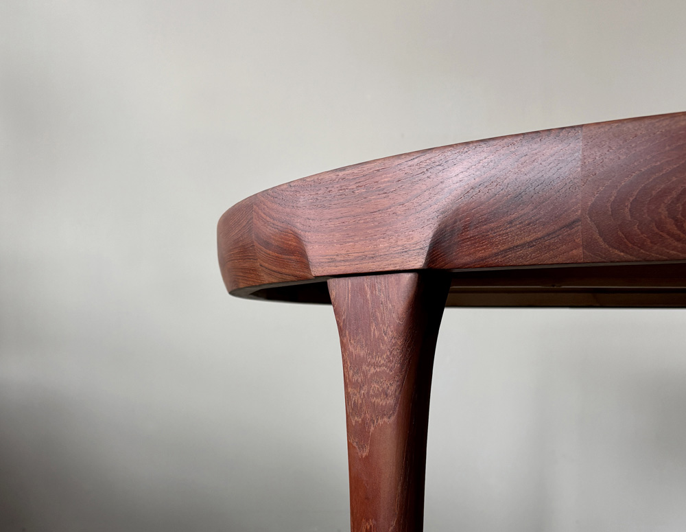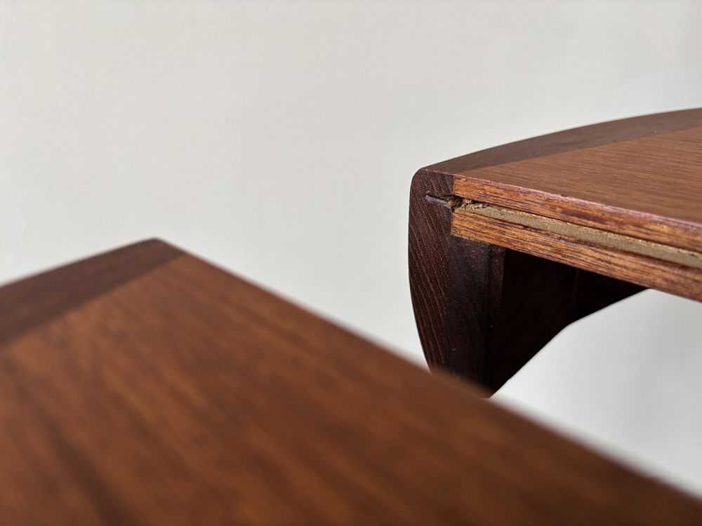 Die Tischplatten sind mit einem rötlich-warmen, dezent gemaserten Teakholz furniert, wobei die Kanten der Platten von einer sehr starken Teak-Massivholzleiste eingefasst sind. Die Tischbeine sind ebenfalls massiv, mit dem Tischgestell verschraubt und können für einen Transport leicht demontiert werden.