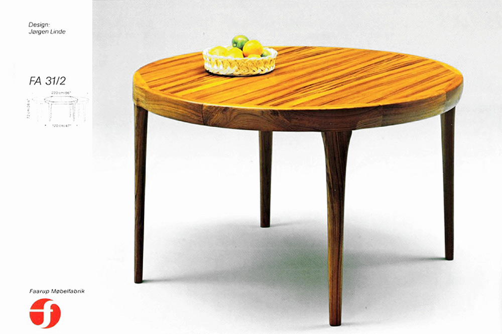 Der ansprechende Esstisch wird immer wieder, und fälschlicherweise, dem (bekannteren) Designer Ib Kofod-Larsen zugeschrieben, wobei in Wahrheit der zwar weniger bekannte, aber nicht minder talentierte Möbelgestalter Jørgen Linde für diesen Entwurf Verantwortung trägt.