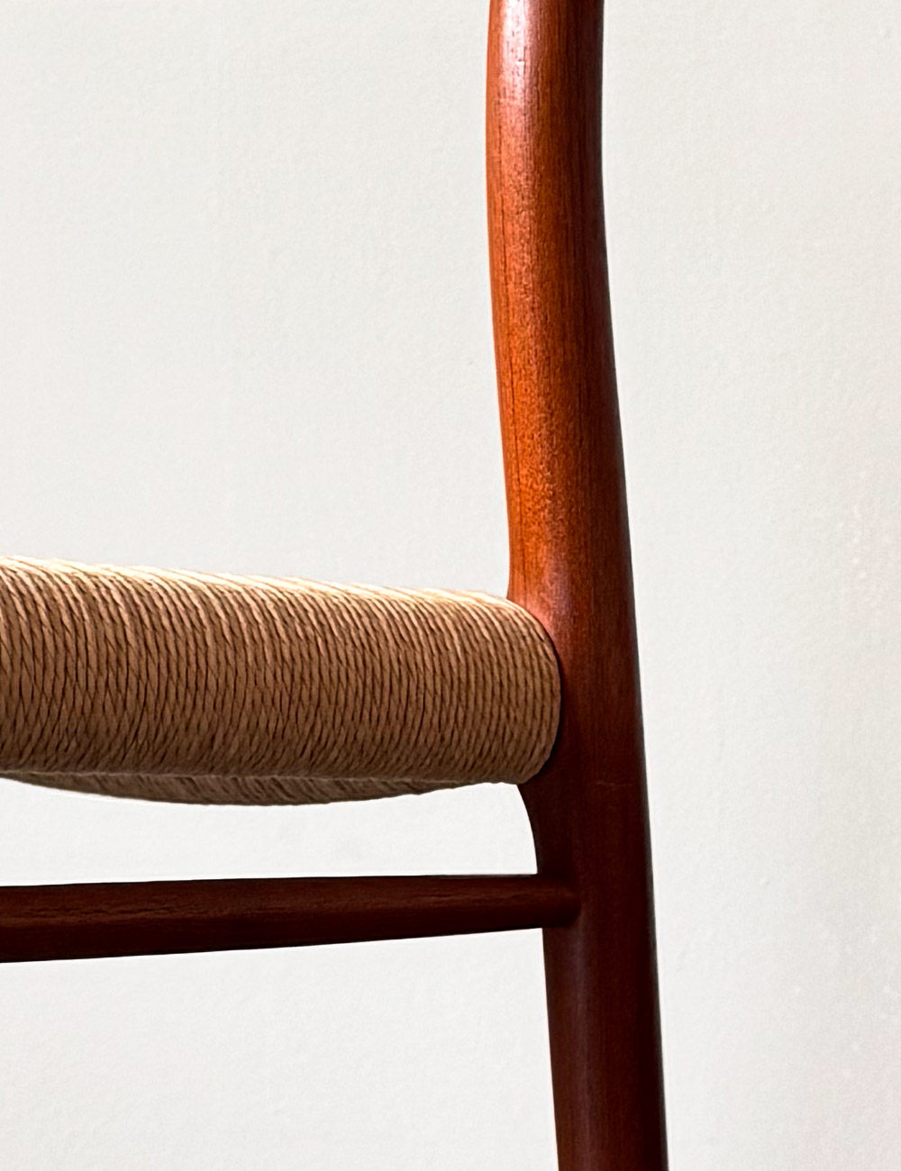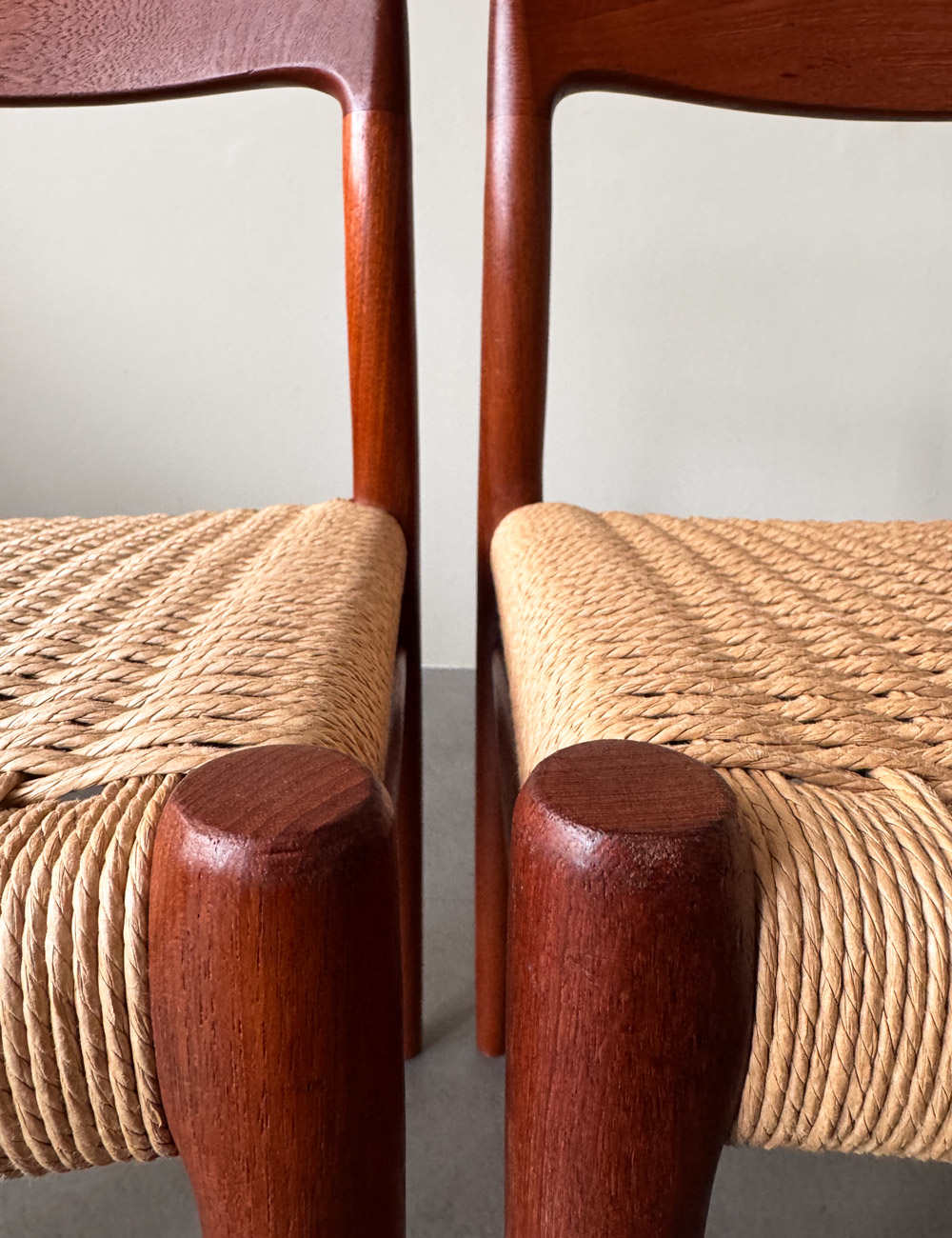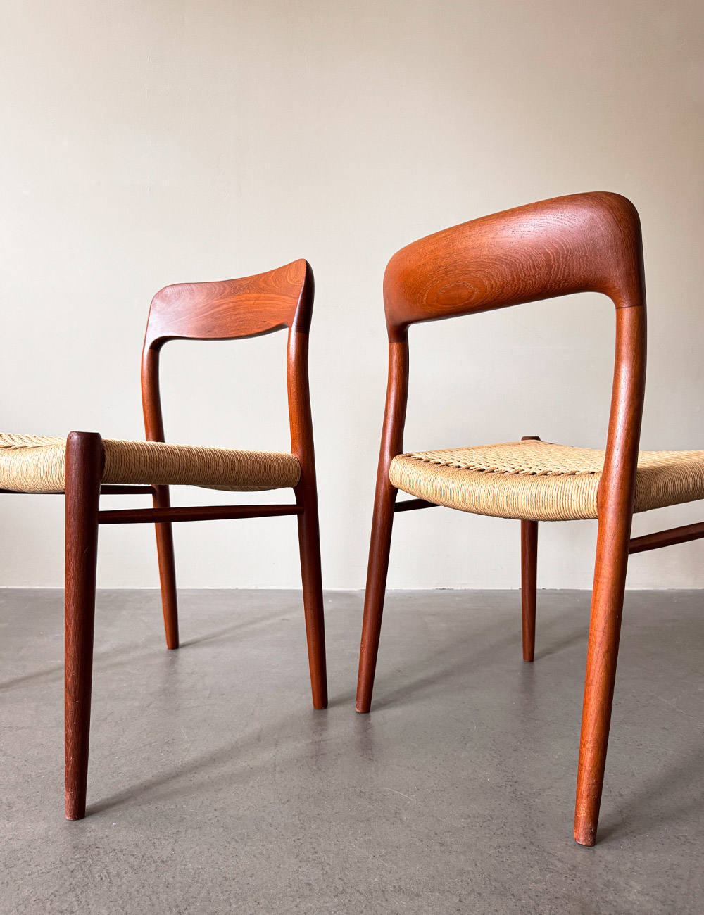 Diese Stühle wurden von Niels O. Møller für JL Møllers Møbelfabrik entworfen. Das Modell 75 zählt zu den bekanntesten Entwürfen des Designers und steht exemplarisch für die dänische Handwerkskunst der 1950er Jahre.