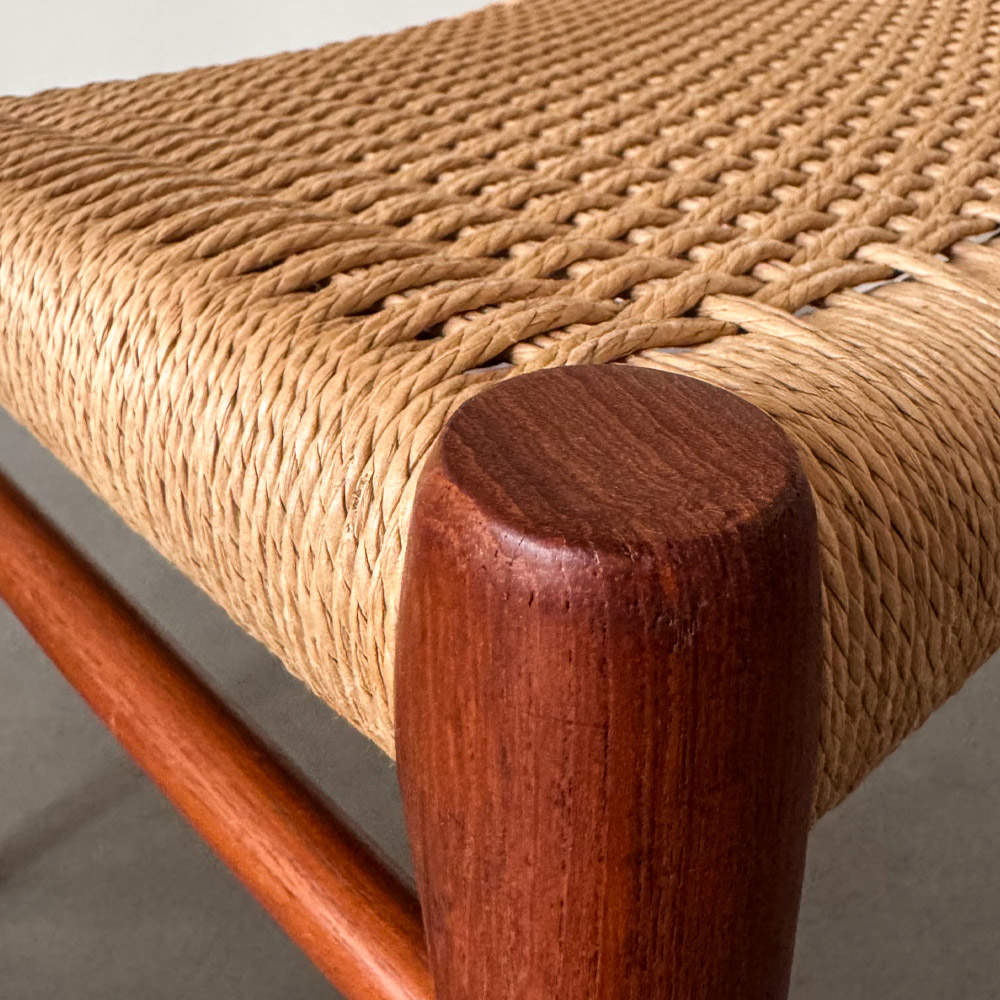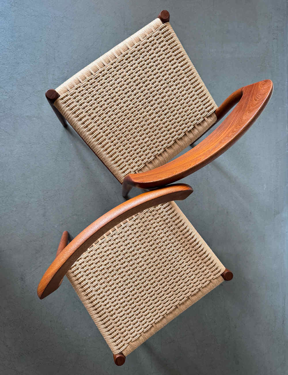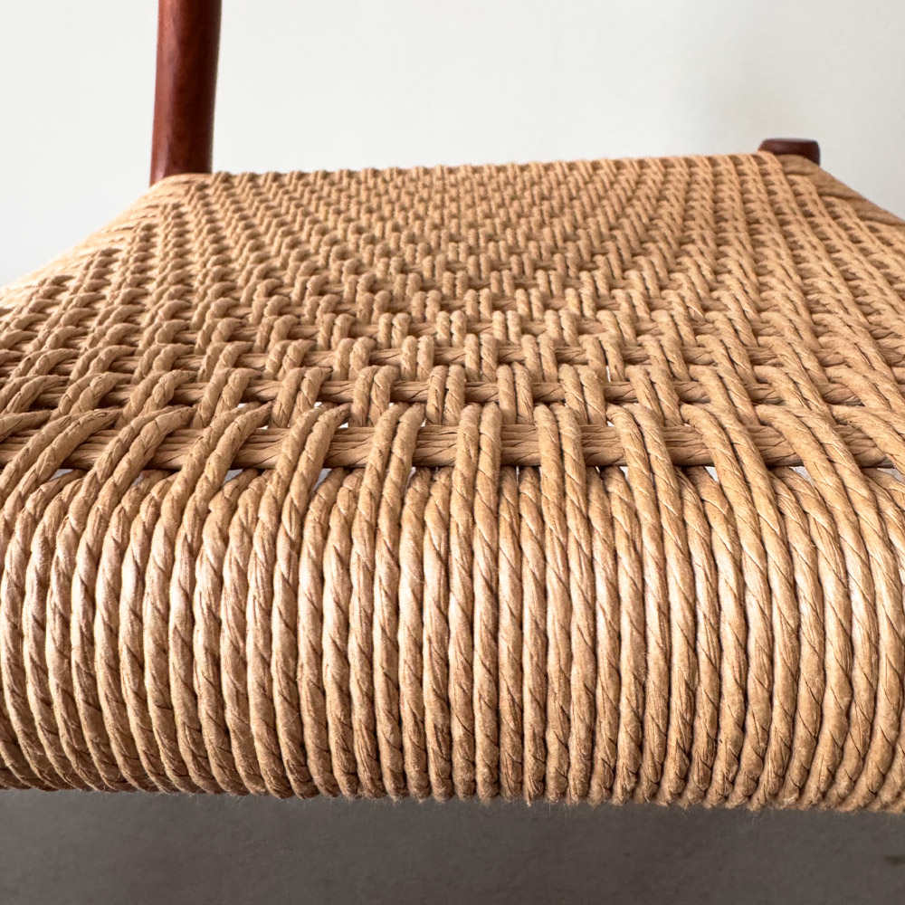Die Rückenlehne und Gestell gehen fließend ineinander über, wodurch eine harmonische Silhouette entsteht. Die Sitze sind mit handgeflochtenem Papiergeflecht versehen, das in seiner warmen Farbigkeit und feinen Struktur einen schönen Kontrast zum Teakholz bildet.