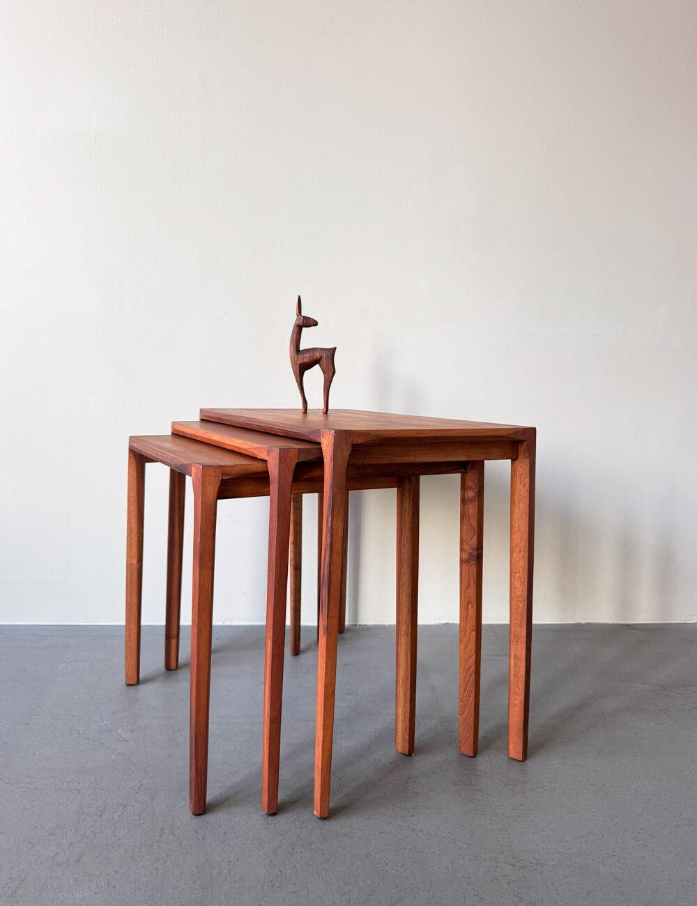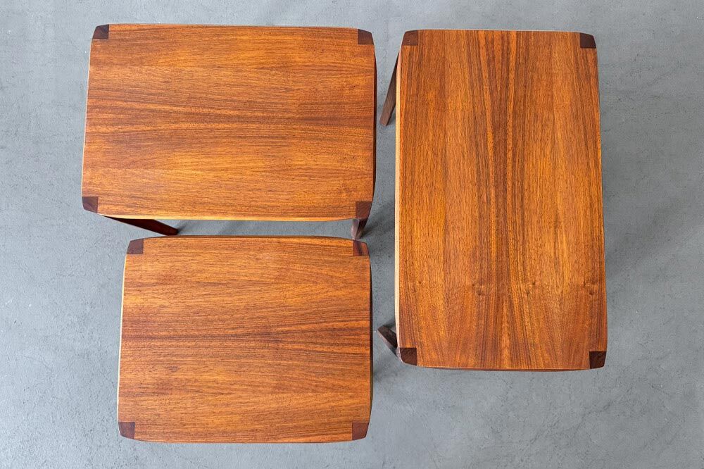 Dieses dreiteilige Satztisch-Set wurde in den 1950er Jahren vom britischen Architekten und Designer Rex Raab für Wilhelm Renz KG entworfen. Charakteristisch sind die fein modellierten, pentagonal geformten Beine und die schlanken Massivholzumrandungen, welche die beidseitig furnierten Tischplatten fassen. Die hochwertige Verarbeitung zeigt sich besonders in den warmen, gleichmäßigen Farbtönen des Nussbaumholzes und der sorgfältigen handwerklichen Ausarbeitung aller Kanten und Übergänge.