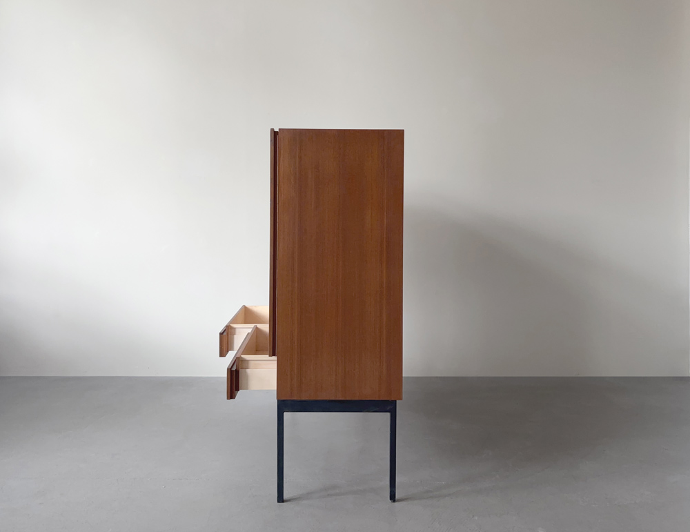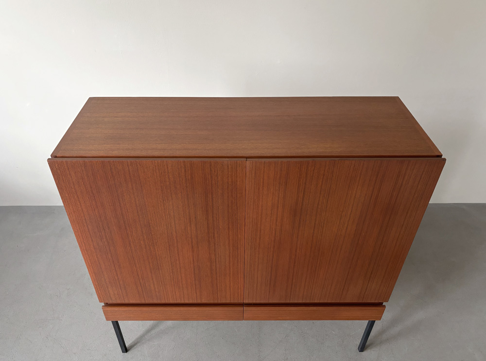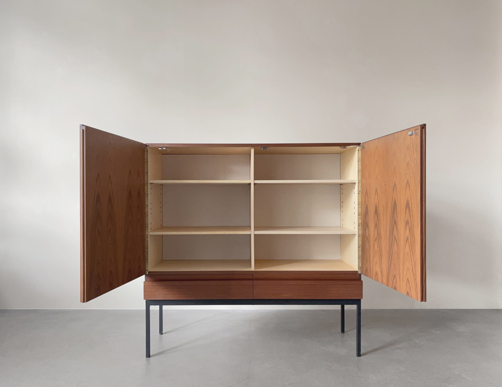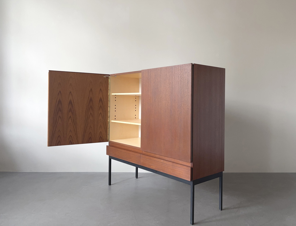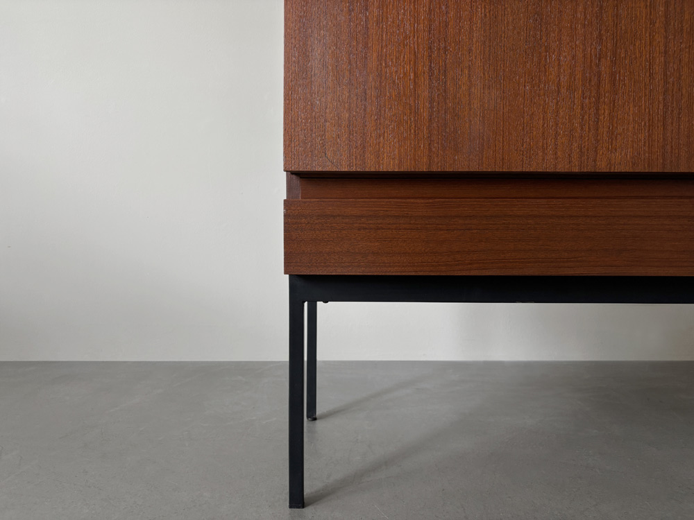 Versteckte Griffleisten an Türen und Schubladen ermöglichen den Verzicht auf angesetzte Griffe. Die Türen werden mittels Schrankmagneten geschlossen gehalten. Der Schrank ist in einem dezent gemaserten Teakholz, der Schrank-Innenraum in hellem Ahorn furniert. Der Innenraum ist in der Hälfte unterteilt und mit insgesamt 4 frei in der Höhe verstellbaren Einlegeböden ausgestattet. Der Schrank steht sicher auf einem schwarz pulverbeschichteten Vierkant-Stahluntergestell, das mit dem Korpus verschraubt ist. Die beiden hinteren Möbelbeine sind mit Nivellierfüßen versehen, um mögliche Unebenheiten im Boden auszugleichen.