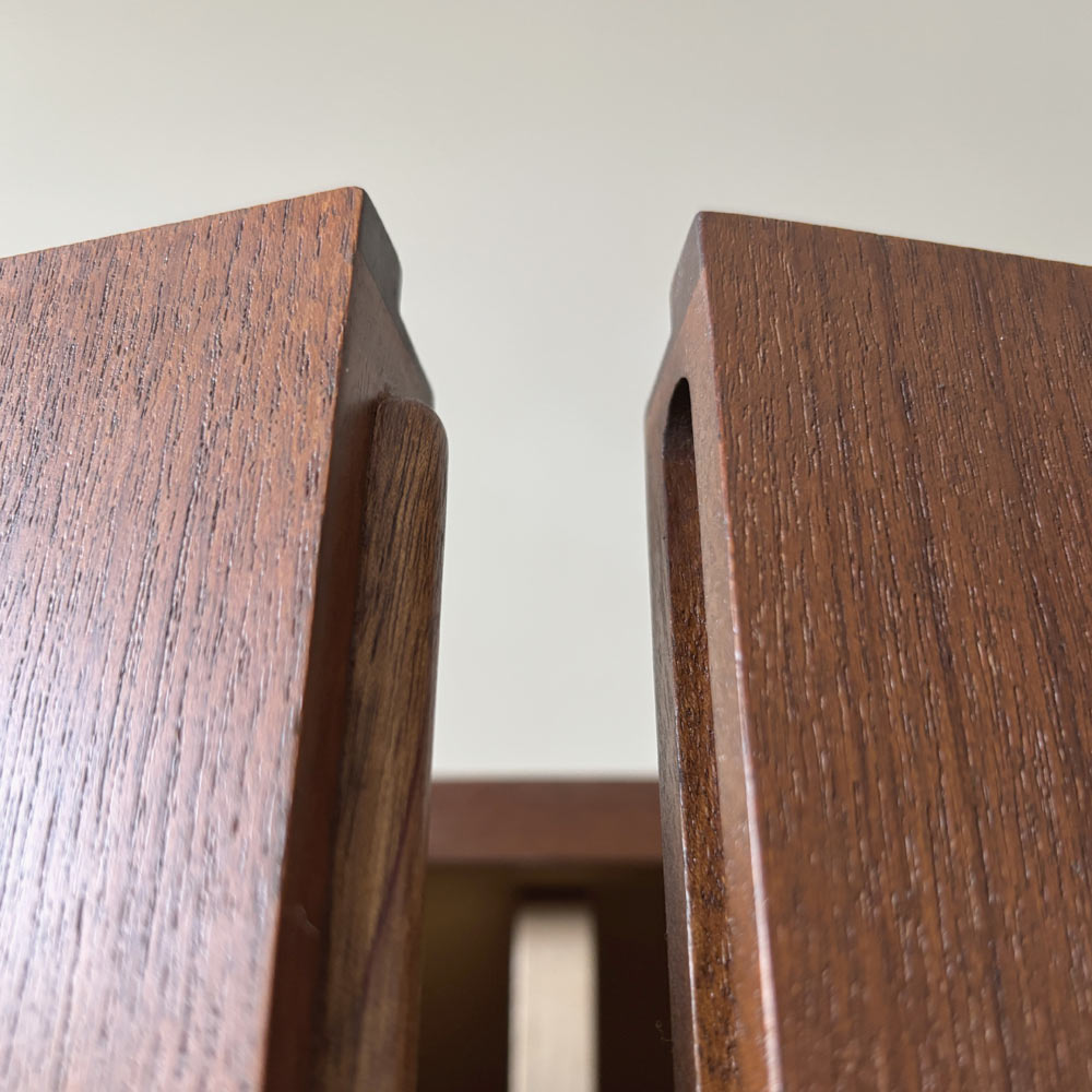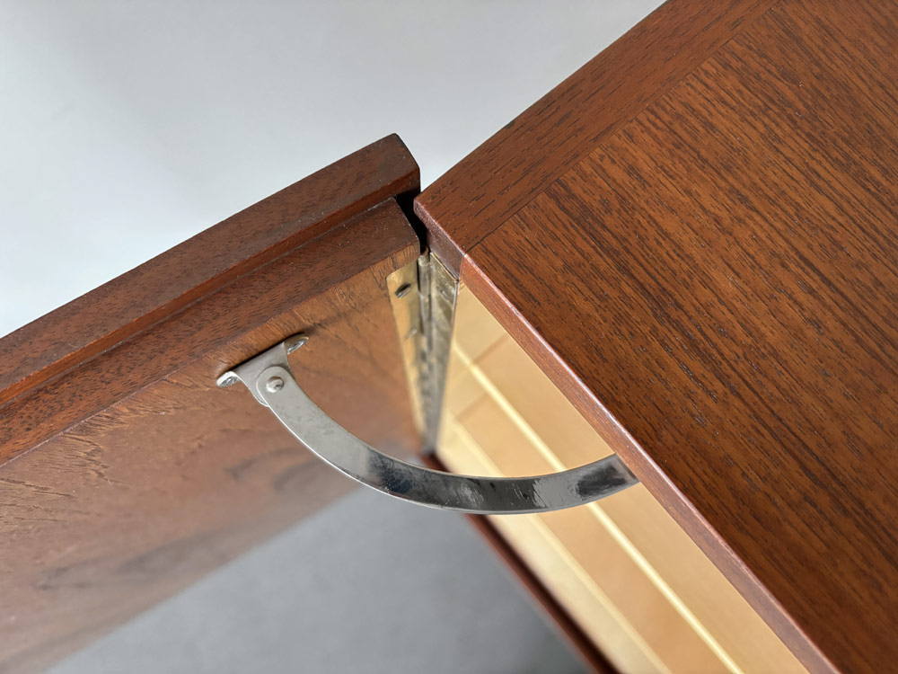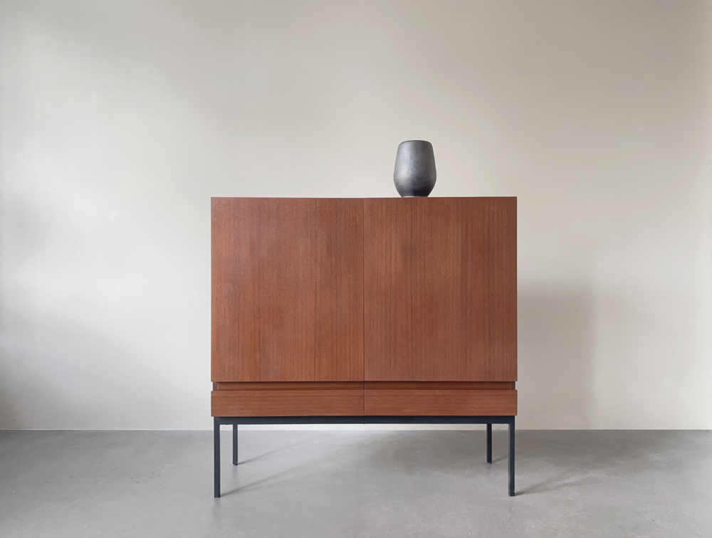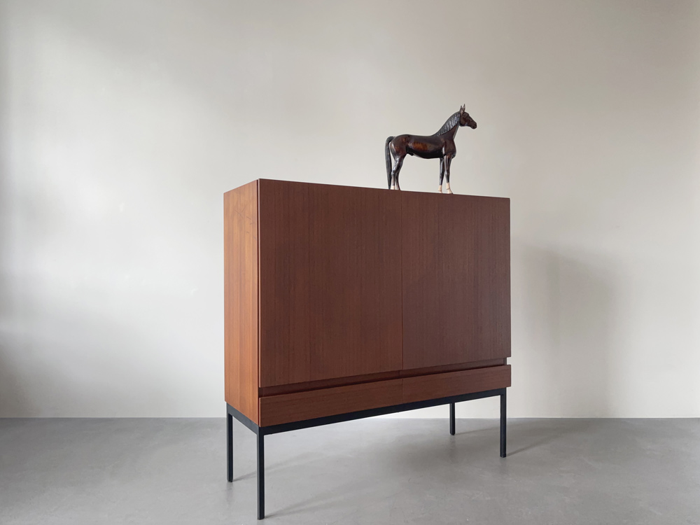Versteckte Griffleisten an Türen und Schubladen ermöglichen den Verzicht auf angesetzte Griffe. Die Türen werden mittels Schrankmagneten geschlossen gehalten. Der Schrank ist in einem dezent gemaserten Teakholz, der Schrank-Innenraum in hellem Ahorn furniert. Der Innenraum ist in der Hälfte unterteilt und mit insgesamt 4 frei in der Höhe verstellbaren Einlegeböden ausgestattet. Der Schrank steht sicher auf einem schwarz pulverbeschichteten Vierkant-Stahluntergestell, das mit dem Korpus verschraubt ist. Die beiden hinteren Möbelbeine sind mit Nivellierfüßen versehen, um mögliche Unebenheiten im Boden auszugleichen.