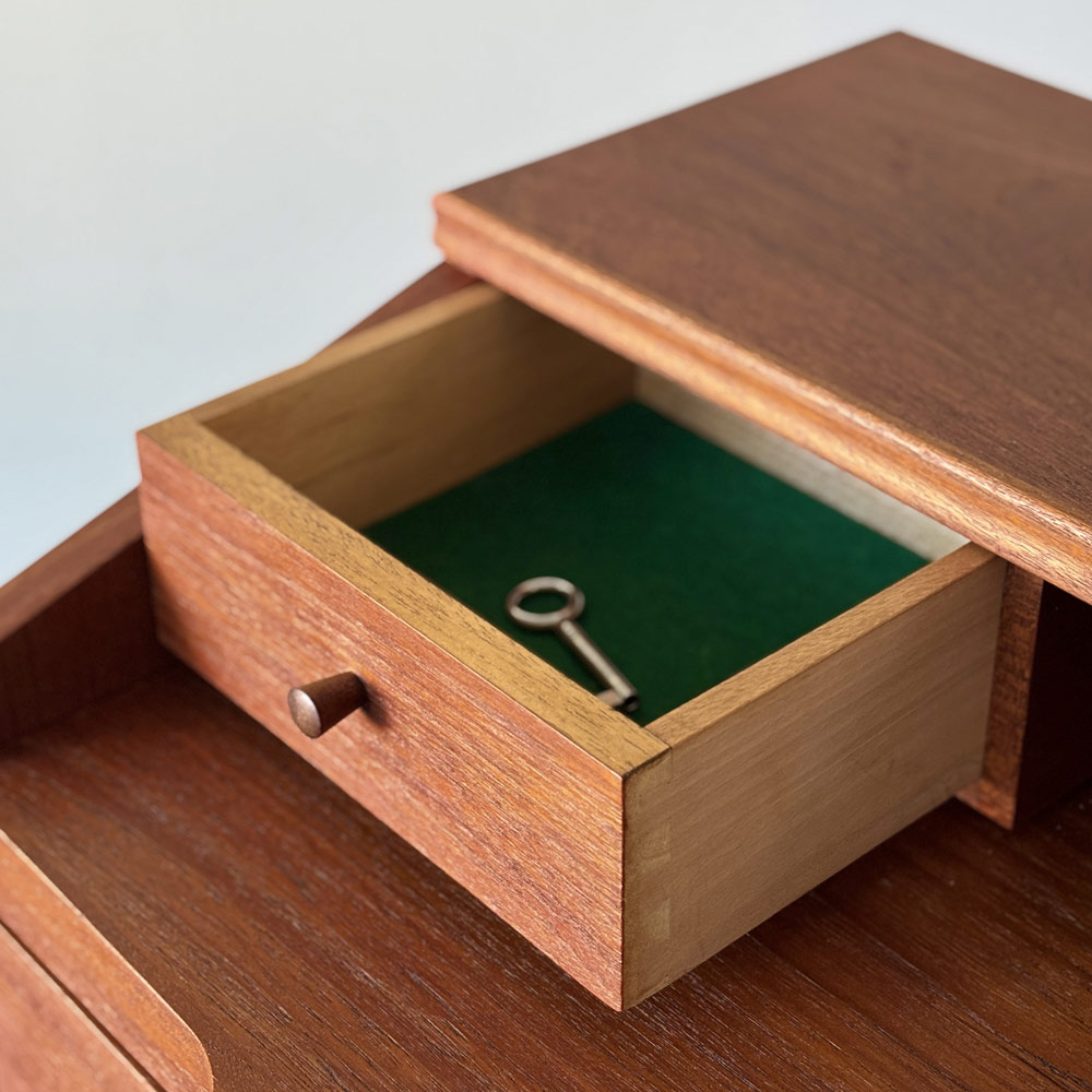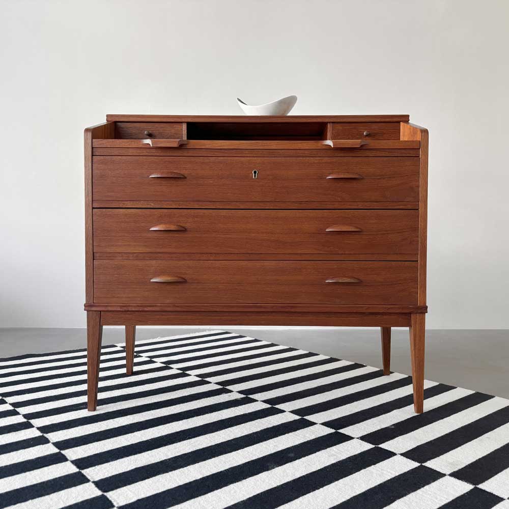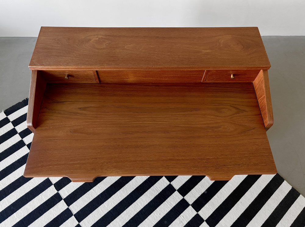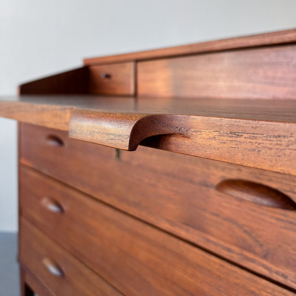 Das Möbel ist in einem dezent gemaserten Teakholz furniert. Griffe und Kanten sind in massiven Teakholz ausgeführt. Drei große und zwei kleine Schubladen bieten diversen Stauraum. Ein schönes Detail sind die muschelförmigen Griffe der großen Schubladen, von denen die Oberste abschließbar ist.