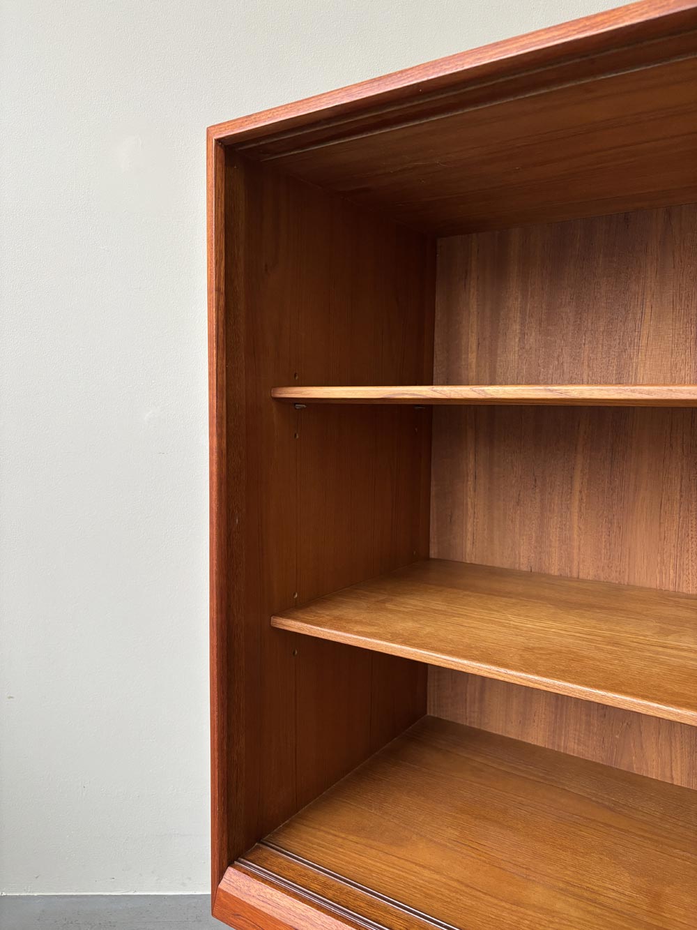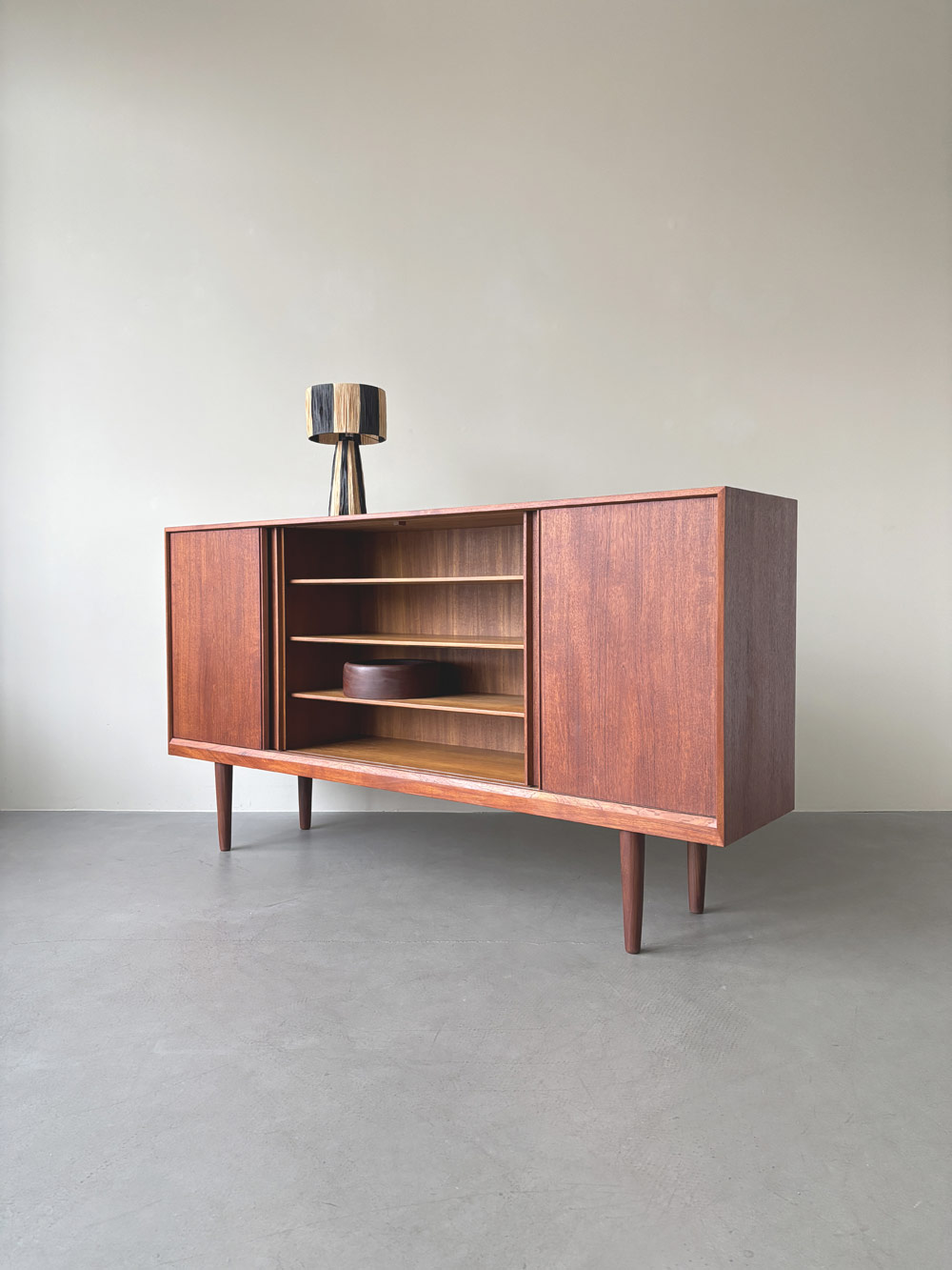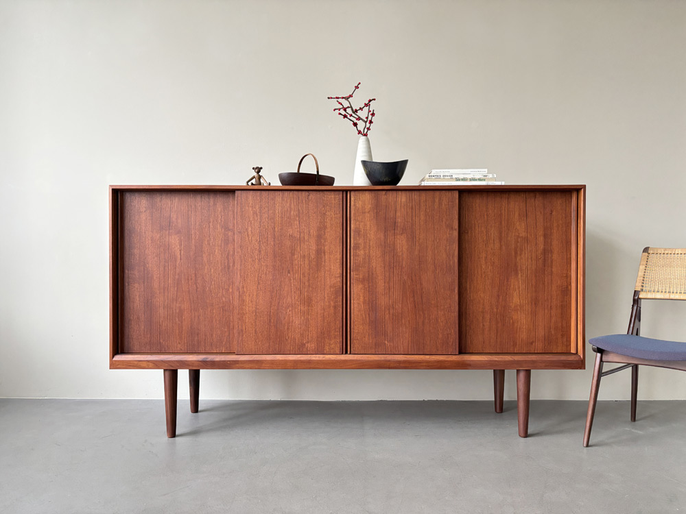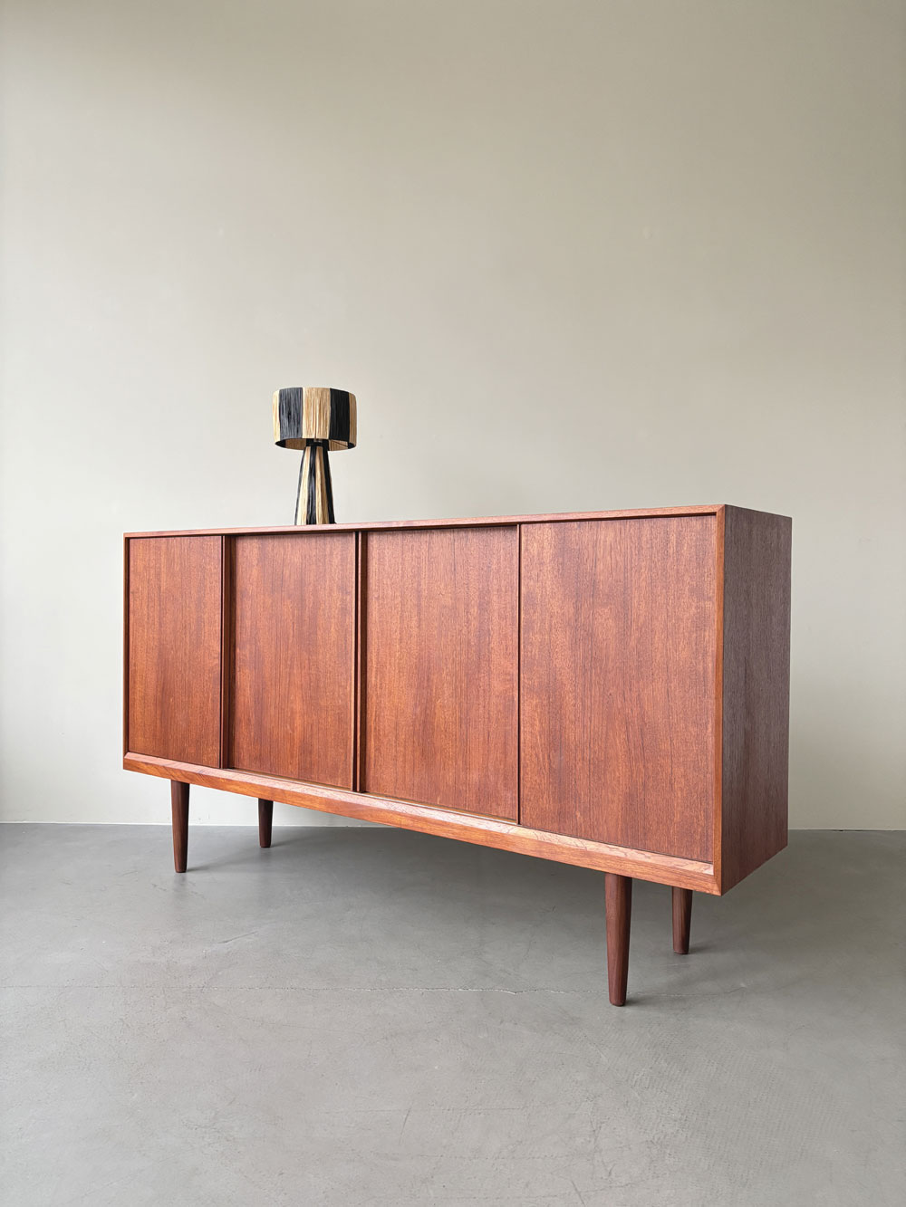 Das Sideboard ist komplett, auch an der Rückseite, mit einem dezent gemaserten, warm rötlichen Teakholzfurnier versehen und steht auf vier konisch geformten, massiven Teakholzbeinen.