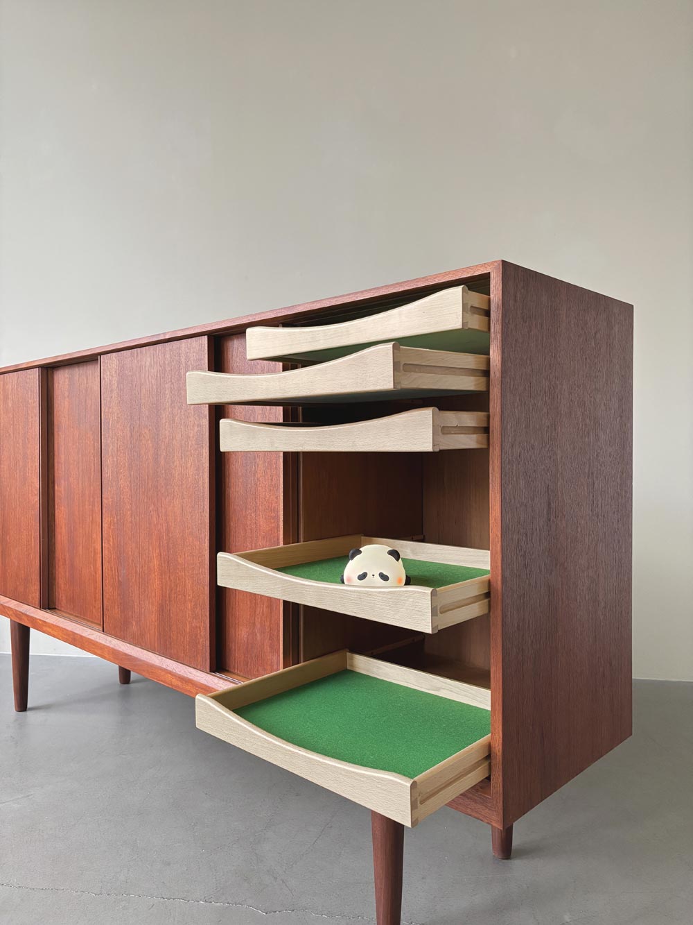 Die vier Schiebetüren besitzen eine über die gesamte Breite eingelassene Griffmulde, sodass keine aufgesetzten Griffe notwendig sind. Der Innenraum gliedert sich in drei Abschnitte: Links und mittig befinden sich insgesamt fünf in der Höhe verstellbare Einlegeböden. Hinter der rechten Schiebetür liegen fünf Schubladen mit grüner Filzauskleidung. Türen und Schubladen laufen schön leichtgängig.