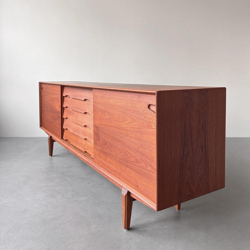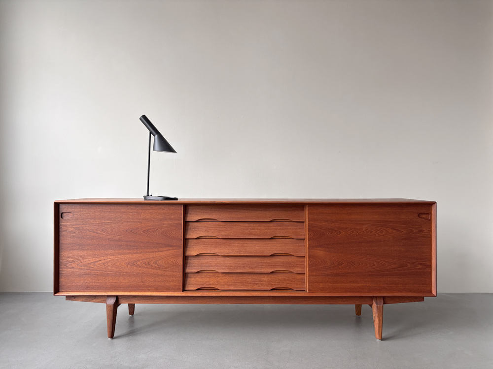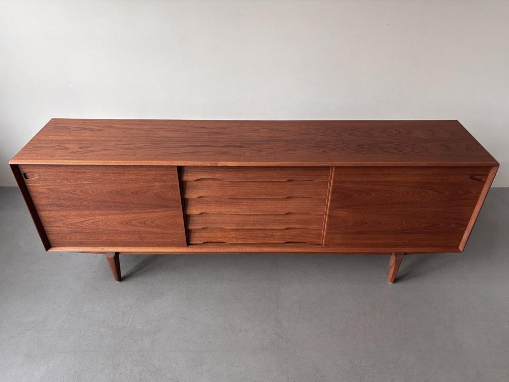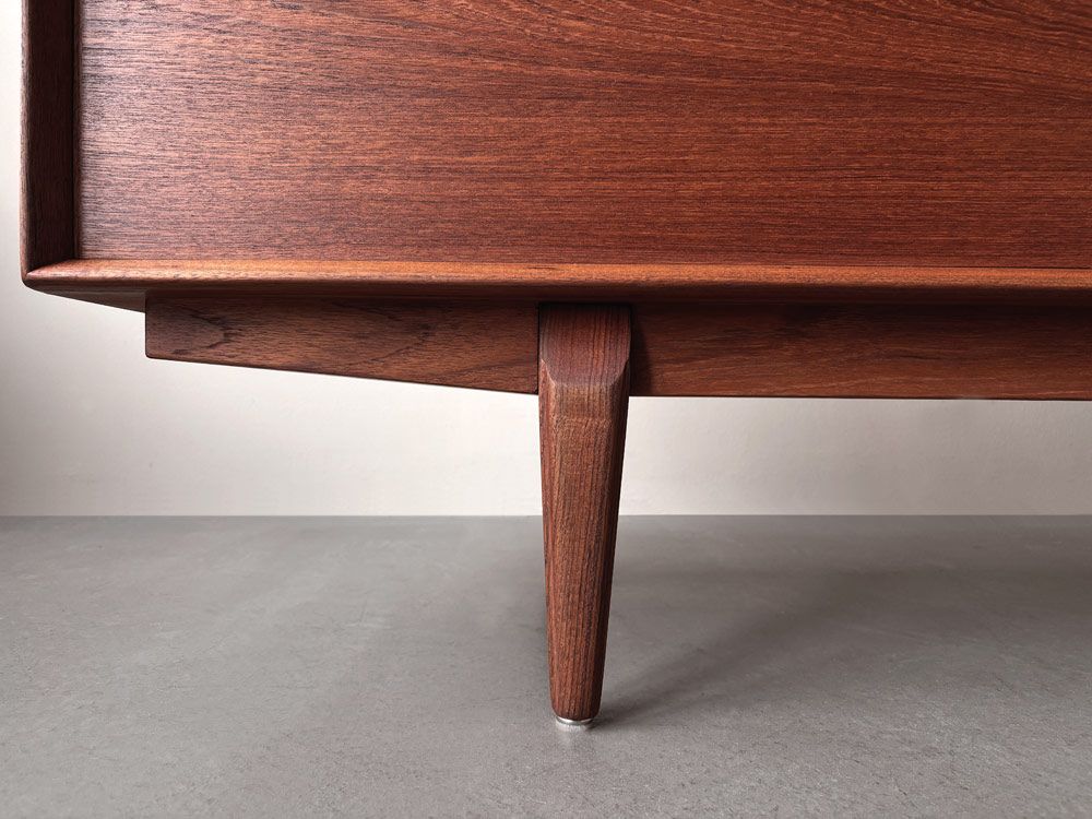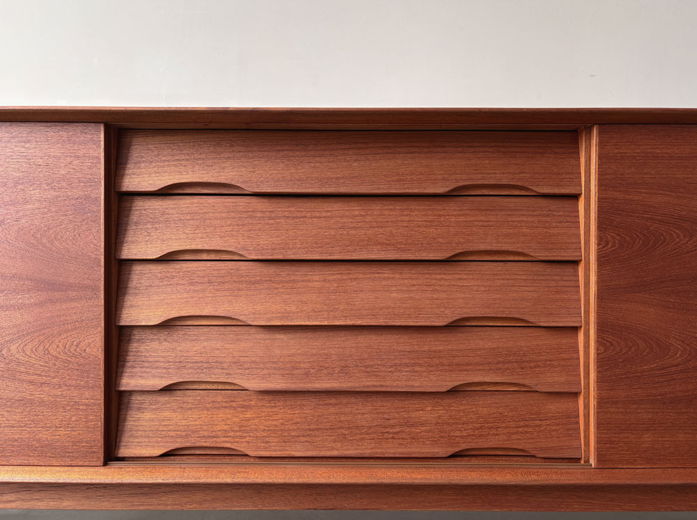 Die Front des Korpus ist mit zwei Schiebetüren links und rechts und den mittig angeordneten fünf Schubladen ausgewogen proportioniert. Das wunderschön gemaserte Teakholzfurnier der Türen ist gespiegelt und nicht wie üblich horizontal, sondern quer aufgebracht. Die Schubladenvorderseiten sind schräg nach innen ausgestellt und mit Griffmulden an der Unterkante versehen. Der Sideboard-Innenraum ist mit drei in der Höhe variablen Einlegeböden unterteilt. Das Sideboard steht sicher auf einem mit dem Korpus verschraubten Untergestell mit angesetzten, sich konisch zum Boden verjüngenden Teak-Massivholzbeinen. Herstellerlabel im Innenraum.