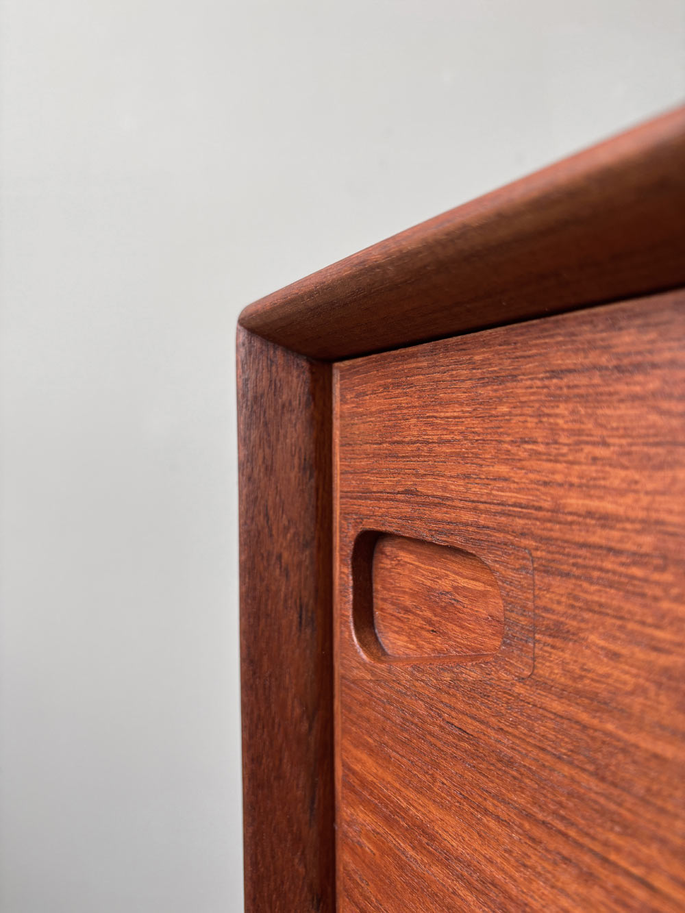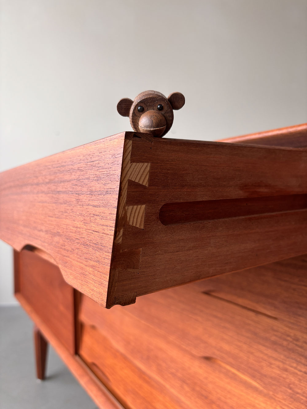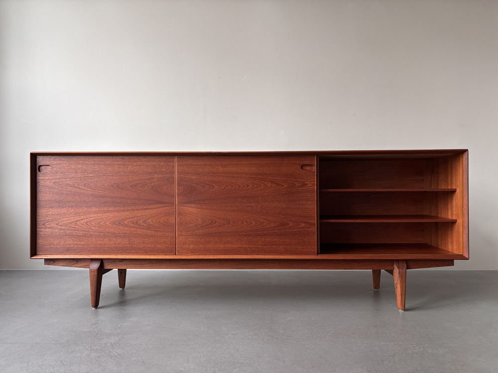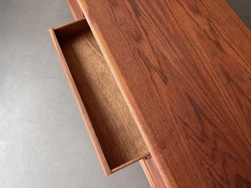 Die Front des Korpus ist mit zwei Schiebetüren links und rechts und den mittig angeordneten fünf Schubladen ausgewogen proportioniert. Das wunderschön gemaserte Teakholzfurnier der Türen ist gespiegelt und nicht wie üblich horizontal, sondern quer aufgebracht. Die Schubladenvorderseiten sind schräg nach innen ausgestellt und mit Griffmulden an der Unterkante versehen. Der Sideboard-Innenraum ist mit drei in der Höhe variablen Einlegeböden unterteilt. Das Sideboard steht sicher auf einem mit dem Korpus verschraubten Untergestell mit angesetzten, sich konisch zum Boden verjüngenden Teak-Massivholzbeinen. Herstellerlabel im Innenraum.