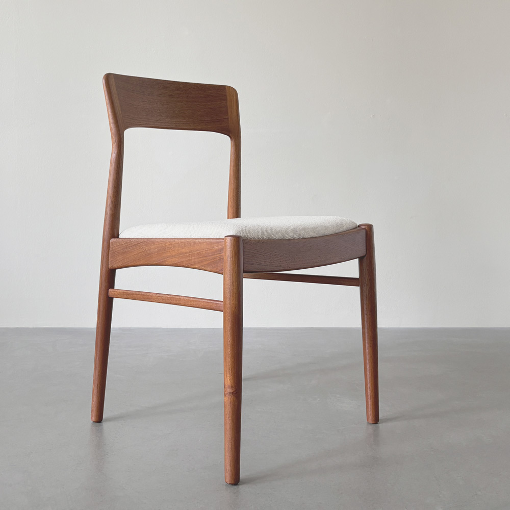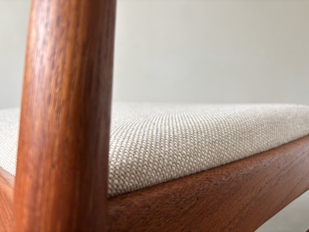 Schlicht, typisch skandinavisch in seiner Designsprache ohne überflüssige Ornamente. Robust und gleichzeitig ausgewogen proportioniert. So oder ähnlich könnte man die schönen Stühle beschreiben. Die Rückenlehne neigt sich leicht zurück, folgt einer ergonomischen, dem Rücken des Sitzenden angepassten Linie. Das Alles in massivem, schön gemasertem Teakholz ausgeführt. Die Stuhlsitzflächen sind mit einem das Holz kontrastierenden, hellen dänischen Kvadrat-Wollstoff bezogen.