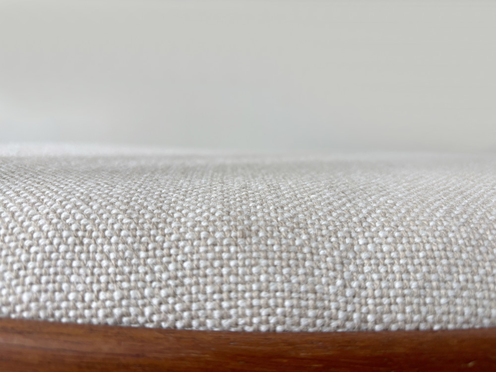 Die Sitzfläche wurde neu gepolstert und mit einem hochwertigen Wollstoff (70 % Schurwolle, 30 % Viskose) von Kvadrat (Hallingdal 65) neu bezogen.