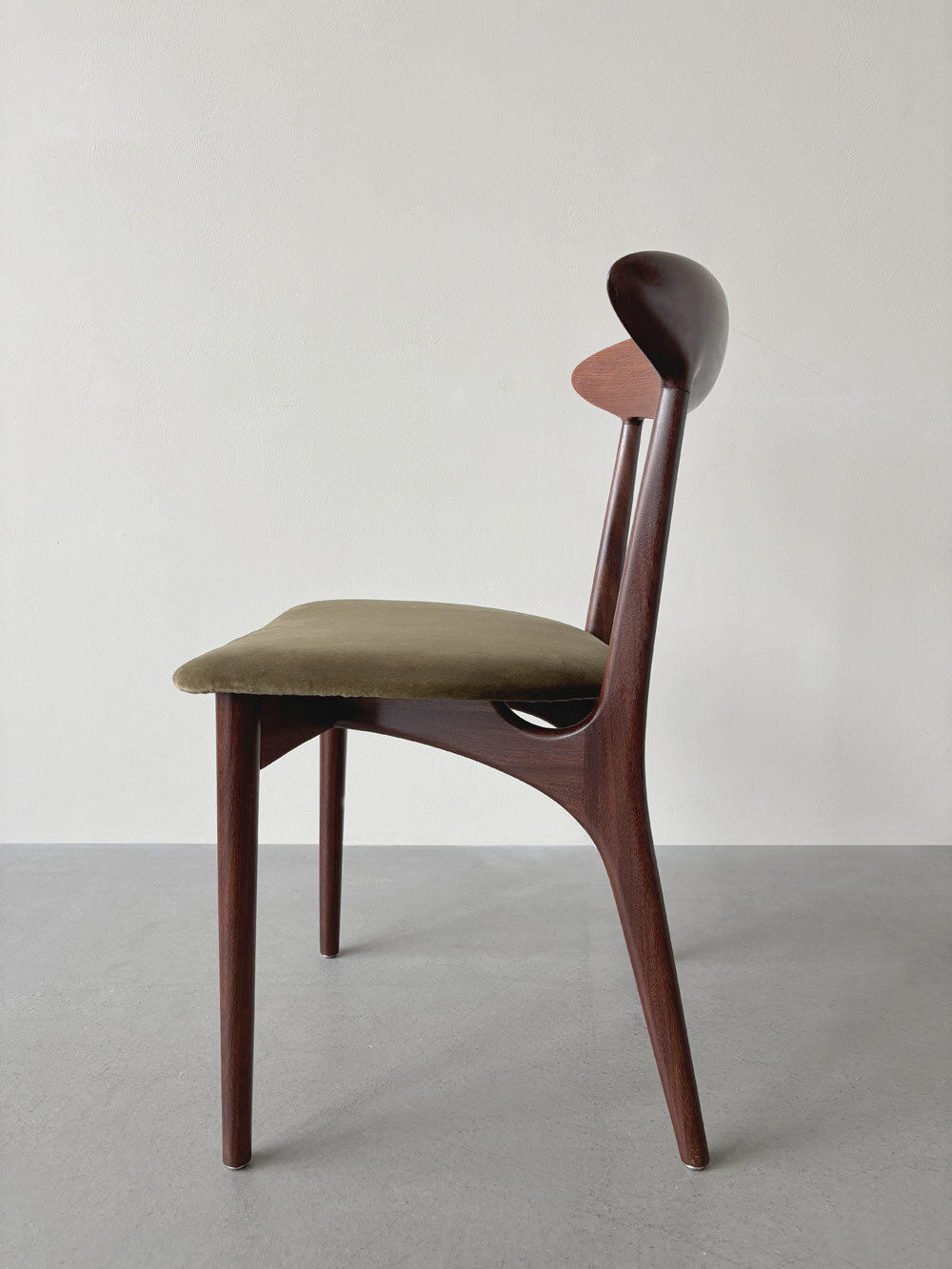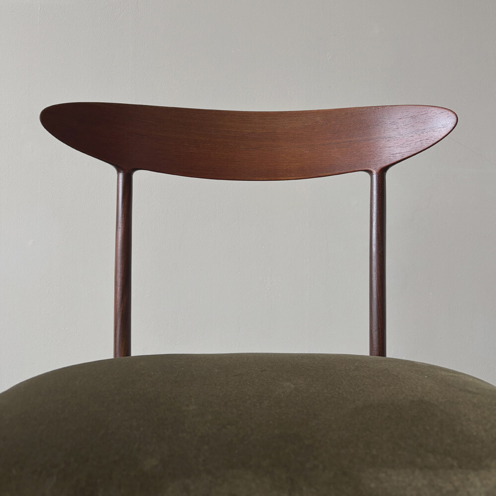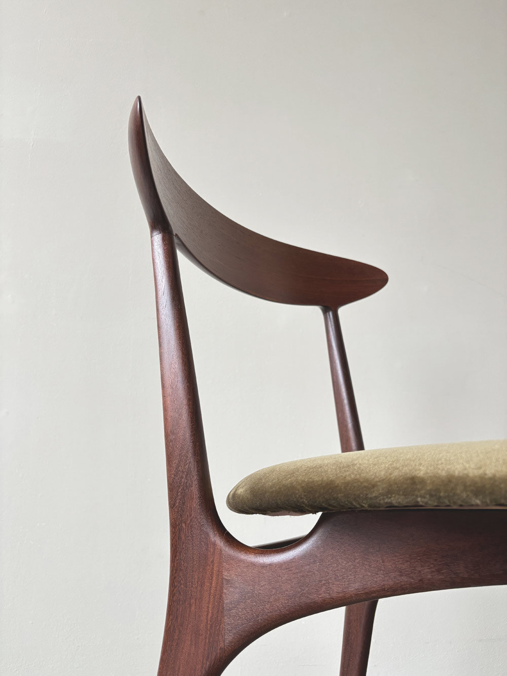 Die Holzversiegelung der Stühle war durch Sonnenlicht mit den Jahren aufgehellt. Um die Maserung wieder hervorzubringen, wurde die alte Versiegelung abgetragen. So konnten auch kleinere Kratzer und Gebrauchsspuren fast komplett beseitigt werden. Das Holz wurde abschließend mit einem Hartöl versiegelt. Die Stühle wurden neu gepolstert und mit einem hochwertigen Baumwoll-Samt von Dedar (Adamo und Eva) neu bezogen.