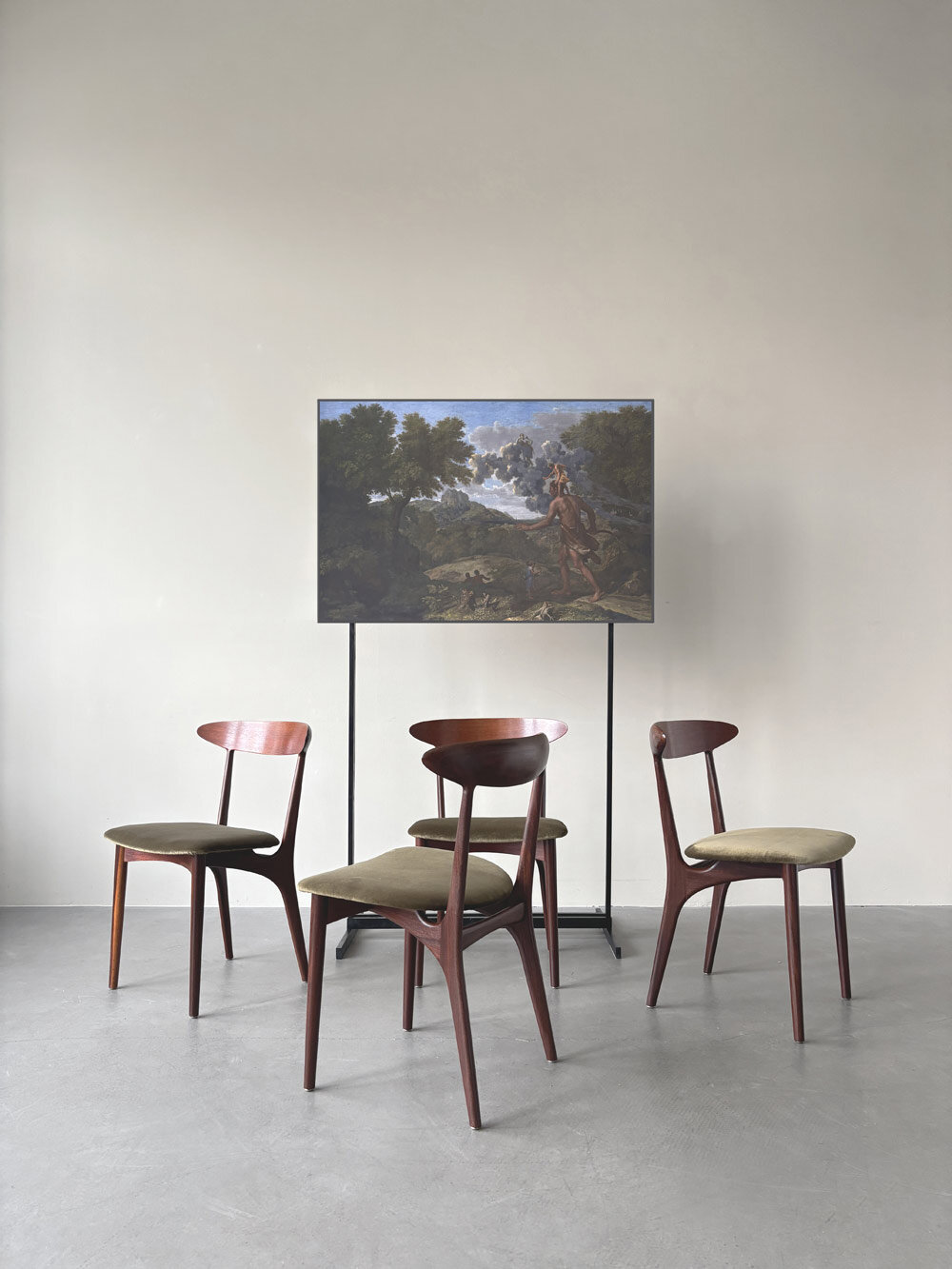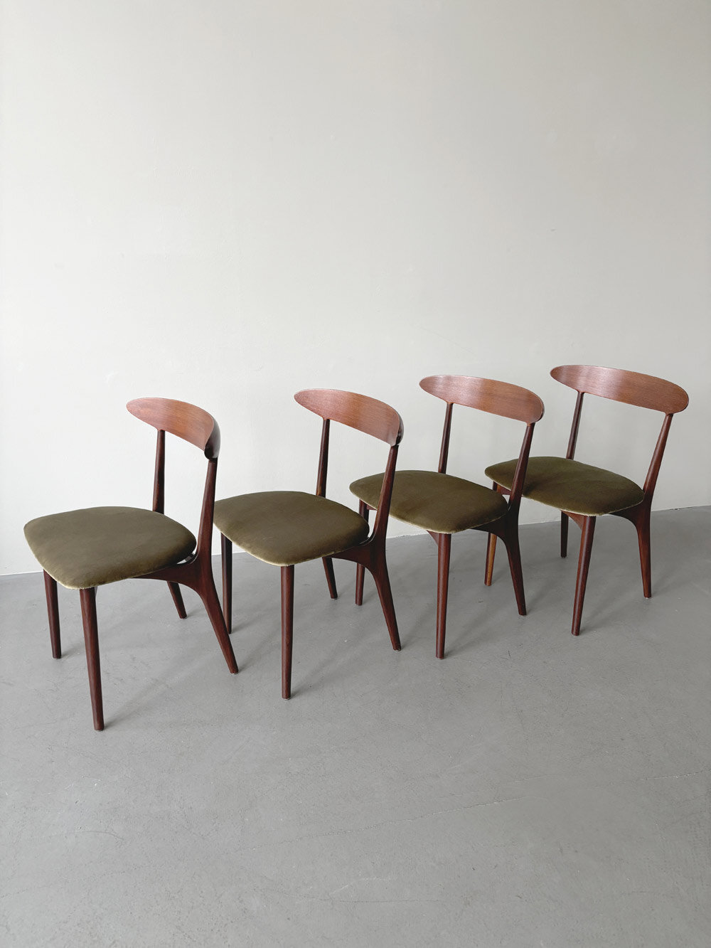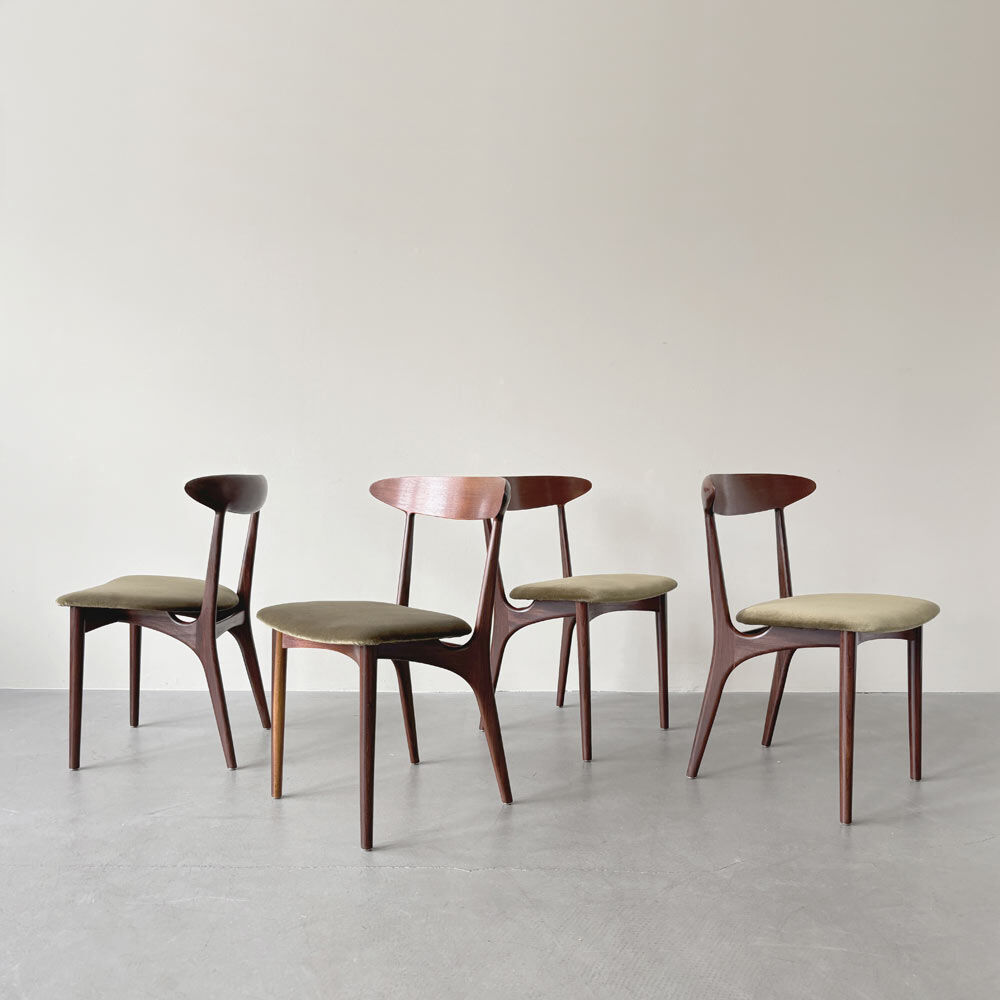 Die Holzversiegelung der Stühle war durch Sonnenlicht mit den Jahren aufgehellt. Um die Maserung wieder hervorzubringen, wurde die alte Versiegelung abgetragen. So konnten auch kleinere Kratzer und Gebrauchsspuren fast komplett beseitigt werden. Das Holz wurde abschließend mit einem Hartöl versiegelt. Die Stühle wurden neu gepolstert und mit einem hochwertigen Baumwoll-Samt von Dedar (Adamo und Eva) neu bezogen.