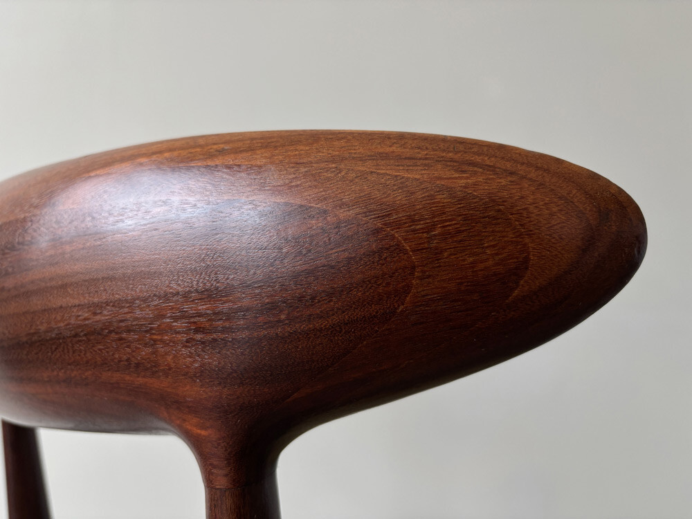 Mit seiner organisch geformten, massiven Rückenlehne ist der Stuhl ein kleines Meisterwerk der Handwerkskunst. Die hinteren Beine sind leicht ausgestellt. Die Querverbindungen der Möbelbeine treffen sich im Kreuz unter der Sitzfläche und geben ihr einen schwebenden Charakter. Ein toller Stuhl.