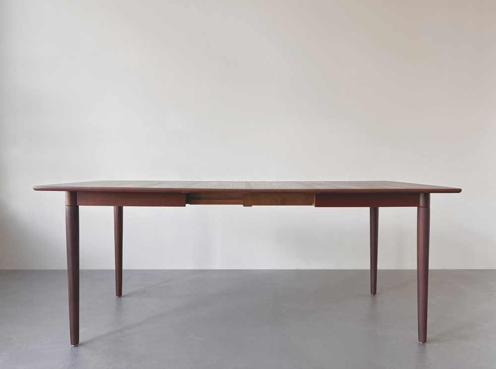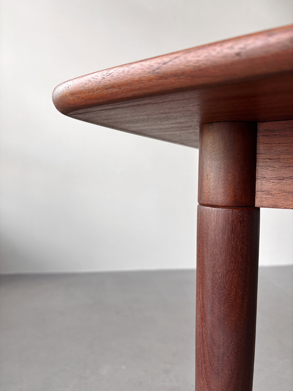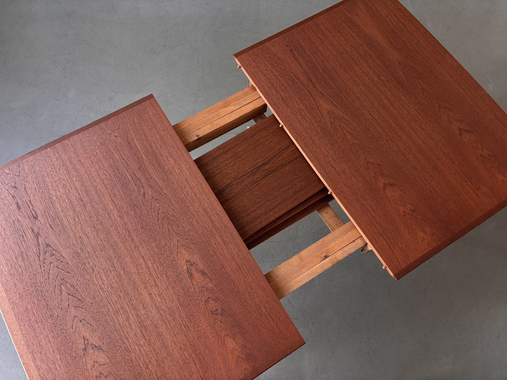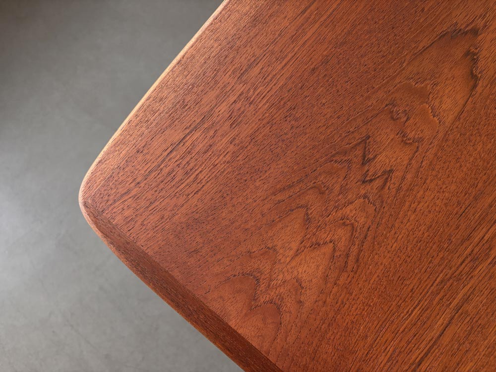 Die Tischplatten sind mit einem dezent gemaserten Teakholz furniert. Die sanft gerundeten, angesetzten Tischkanten und die Tischbeine sind aus massivem Holz gefertigt. Für die Tischbeine wurde das auch afrikanisches Teakholz genannte, leicht dunklere Afrormosia-Holz verwendet. Der Esstisch ist unterseitig mit einem Herstellerstempel gekennzeichnet.