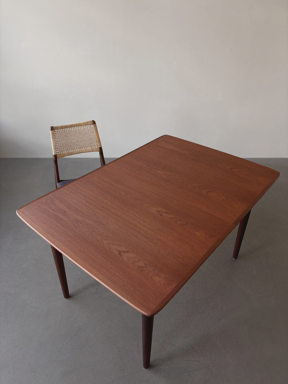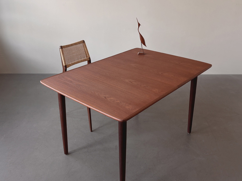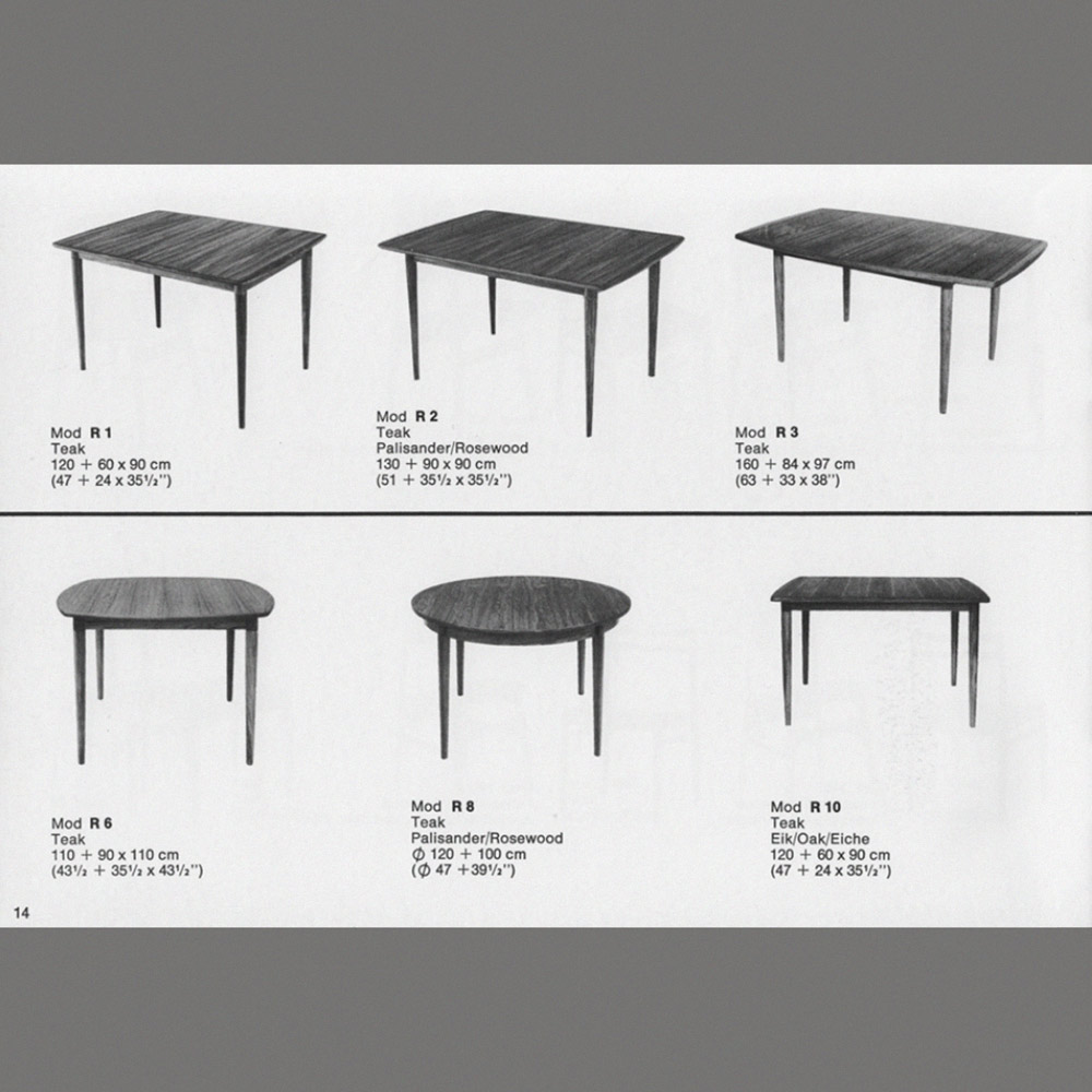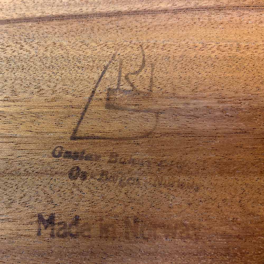 Die Tischplatten sind mit einem dezent gemaserten Teakholz furniert. Die sanft gerundeten, angesetzten Tischkanten und die Tischbeine sind aus massivem Holz gefertigt. Für die Tischbeine wurde das auch afrikanisches Teakholz genannte, leicht dunklere Afrormosia-Holz verwendet. Der Esstisch ist unterseitig mit einem Herstellerstempel gekennzeichnet.