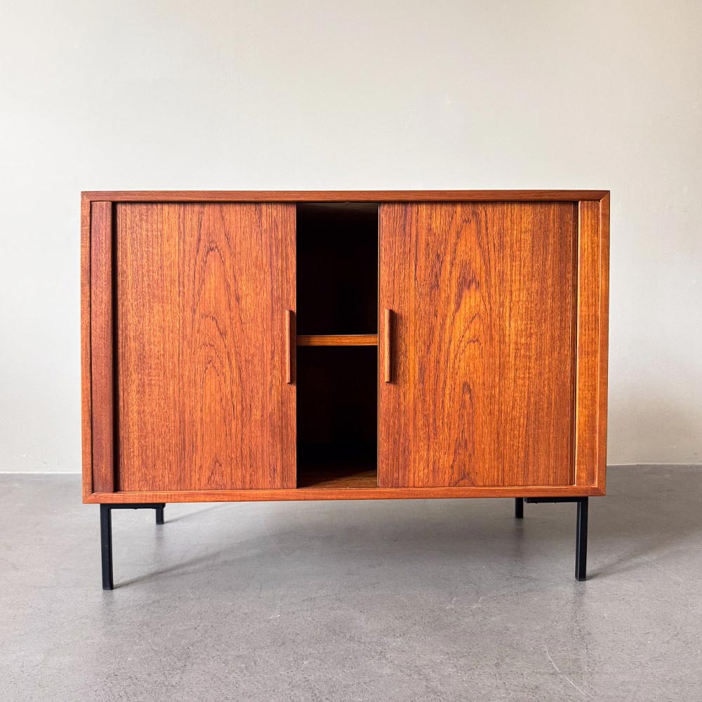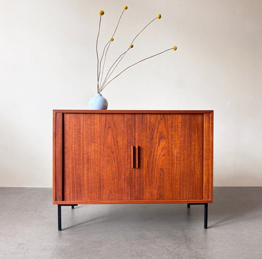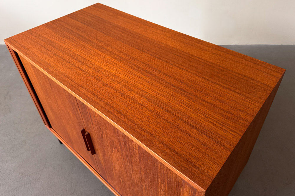 Typisch für Kristiansen verbindet der Entwurf klare Linien, funktionales Design und handwerkliche Präzision – sichtbar in den seltenen, präzise gearbeiteten Tambourtüren, die sich seitlich öffnen und eine durchlaufende, harmonisch verlaufende Holzmaserung über die gesamte Front zeigen.