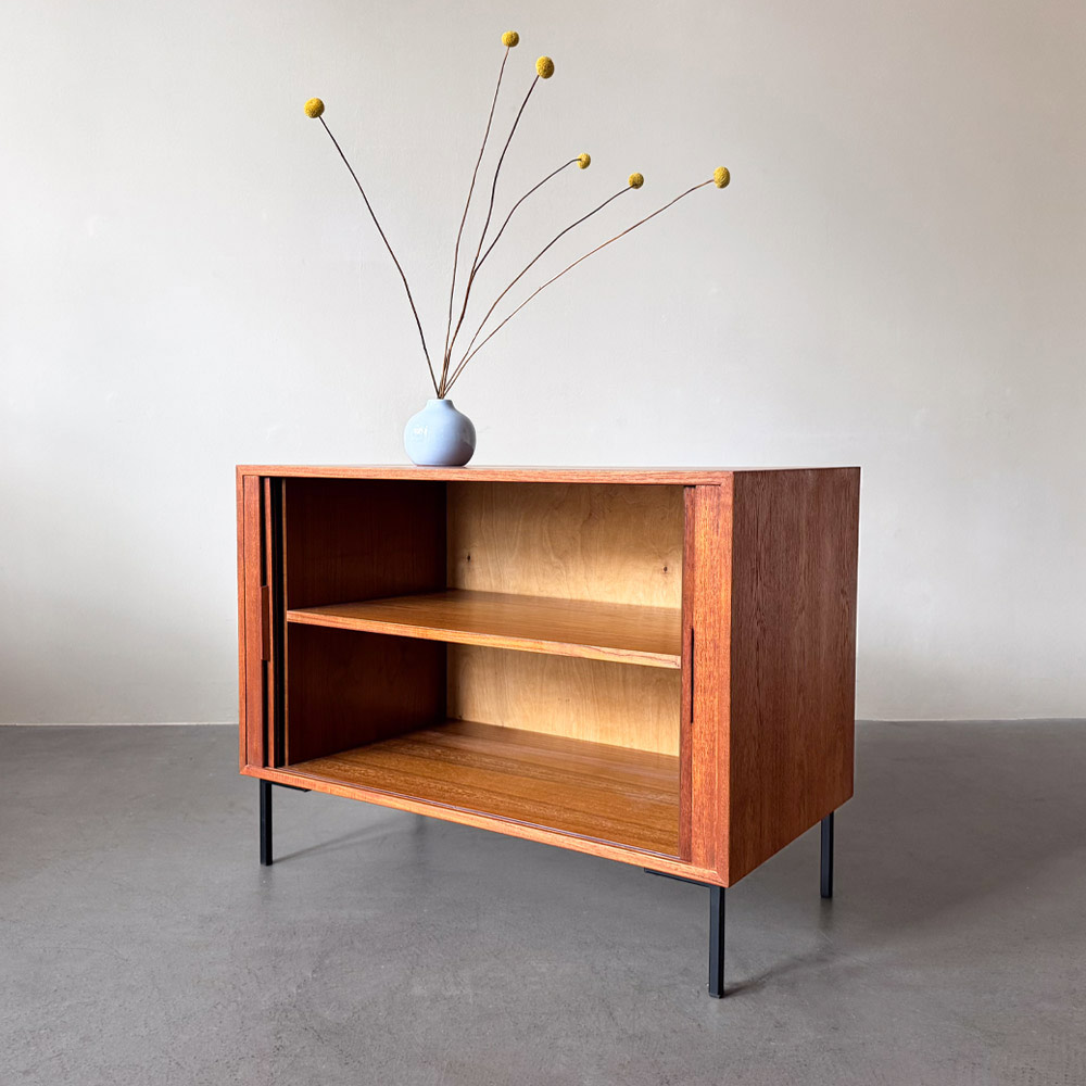 Die Kommode wurde in verschiedenen Ausführungen gefertigt – mit Sockel, Beinen oder zur Wandmontage. Bei diesem Exemplar wurde der ursprüngliche Sockel durch vier minimalistische Stahlbeine in schwarz ersetzt, was dem Möbel eine leichte und zugleich wertige Anmutung verleiht.