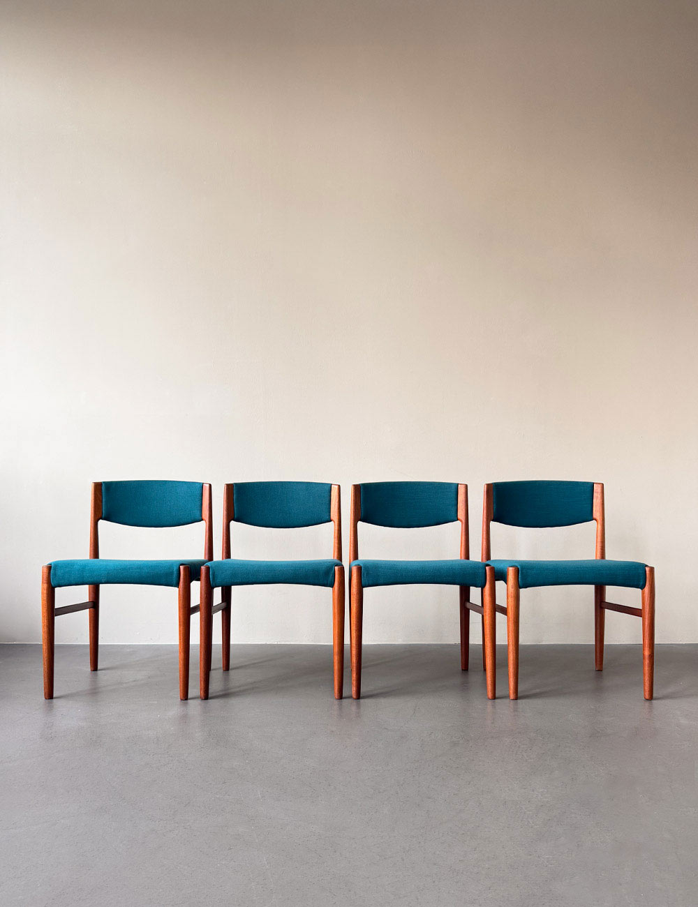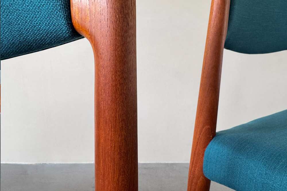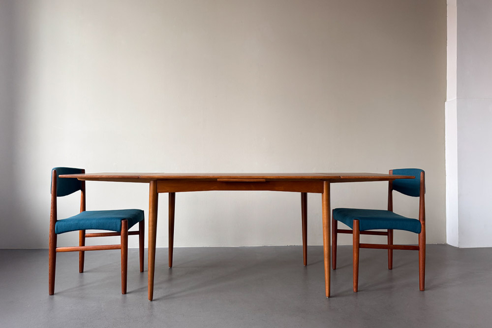 Durch ihre ruhige Formensprache und die kompakte Breite eignen sich die Stühle ideal als Esszimmerbestuhlung, lassen sich aber ebenso gut in Wohn-, Arbeits- oder Besprechungsbereiche integrieren. Insgesamt präsentieren sich die vier Stühle als ausgewogene Kombination aus dänischem Design, funktionalem Aufbau und sorgfältiger handwerklicher Überarbeitung. Der gezeigte Teak-Esstisch ist ebenfalls erhältlich.