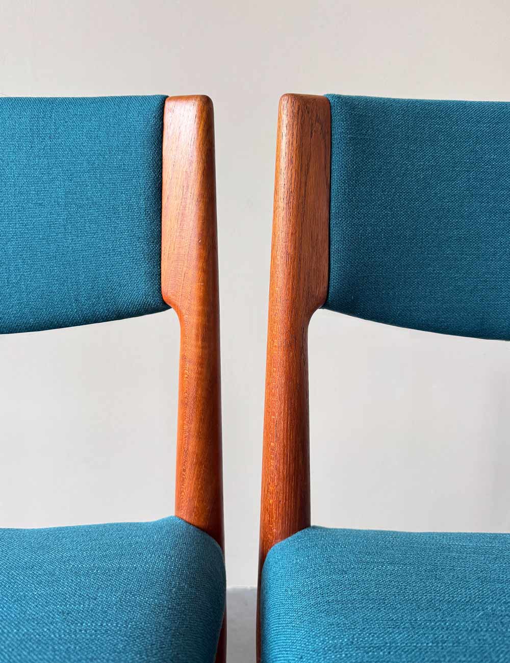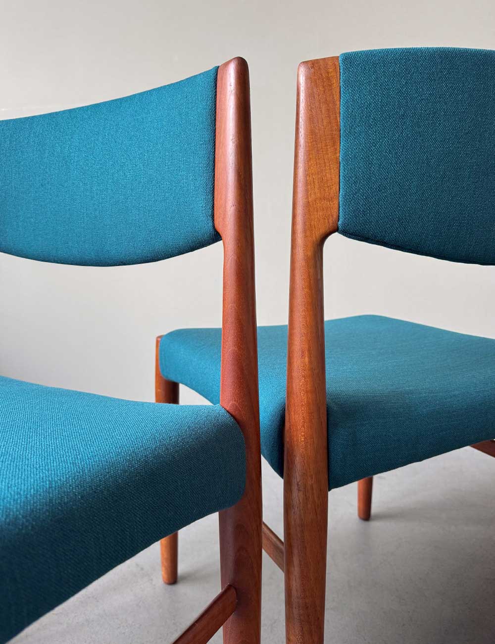 Die Stühle wurden vollständig aufgearbeitet. Das Teakholz zeigt nach der Reinigung und Neubearbeitung seine warmen, rötlich-goldenen Töne und eine ruhige, fein verlaufende Maserung. Ungewöhnlich für vergleichbare Modelle sind die gepolsterten Rückenlehnen, die einen deutlich weicheren Sitzkomfort ermöglichen. Die hohen Lehnenstäbe rahmen das Polster formschön ein und betonen die klare Gestaltung.