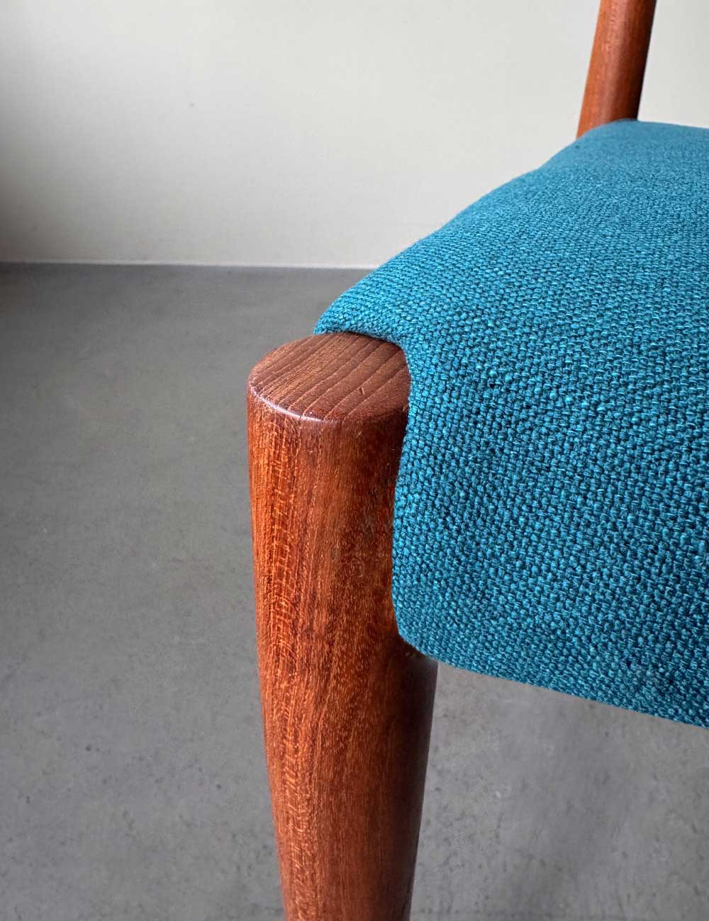 Farbe und Textur des Stoffes harmonieren sehr gut mit dem Teakholz und unterstreichen den zeittypischen, skandinavischen Charakter dieser Stühle.